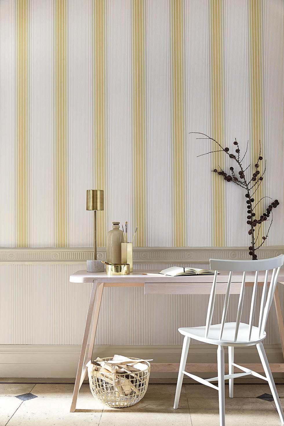 Description: A white table with a white chair and a vase with flowers on it and a striped wallpaper behind it.