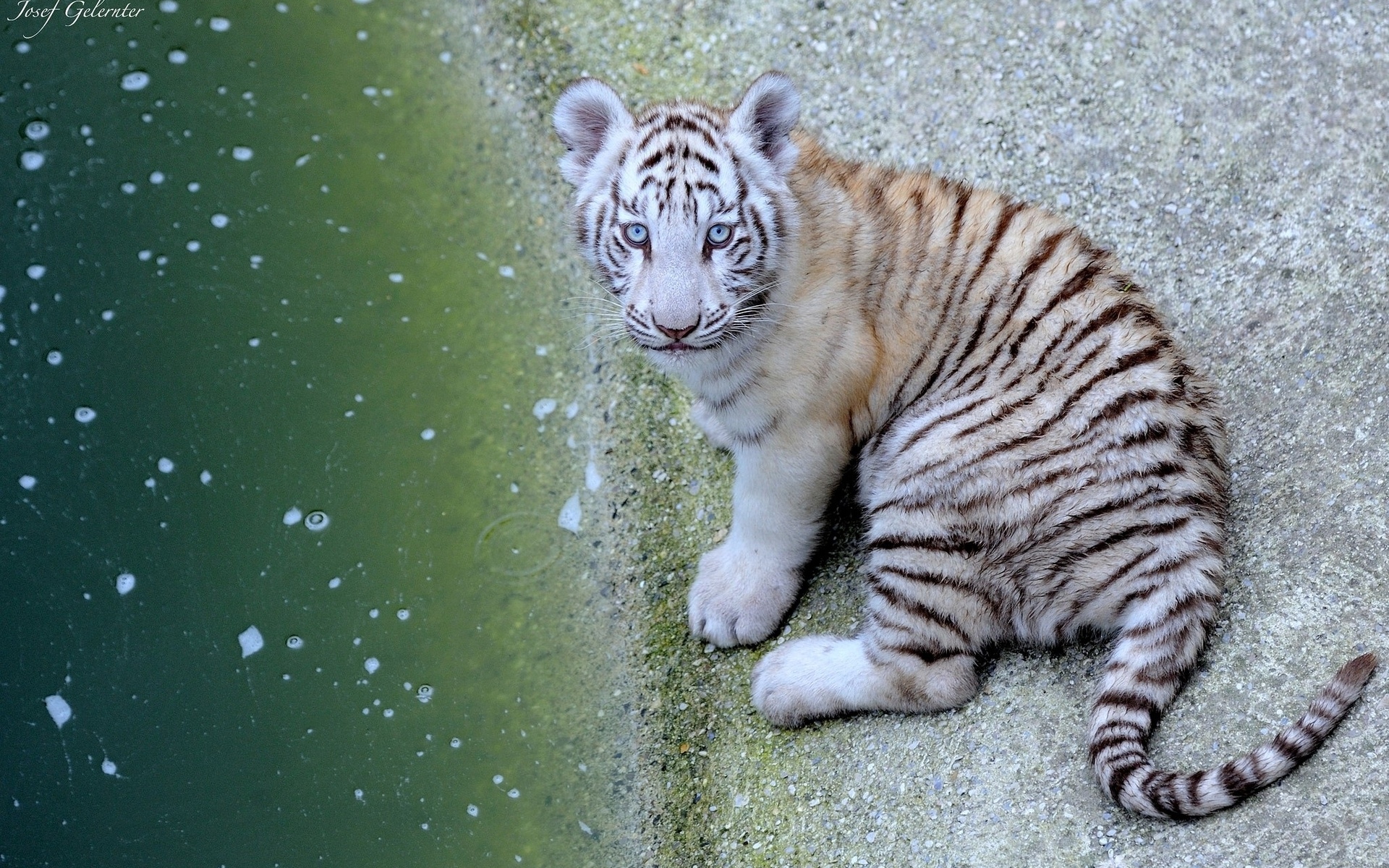 Description: A white tiger cub sitting on a rock next to a body of water with bubbles floating on it's surface.