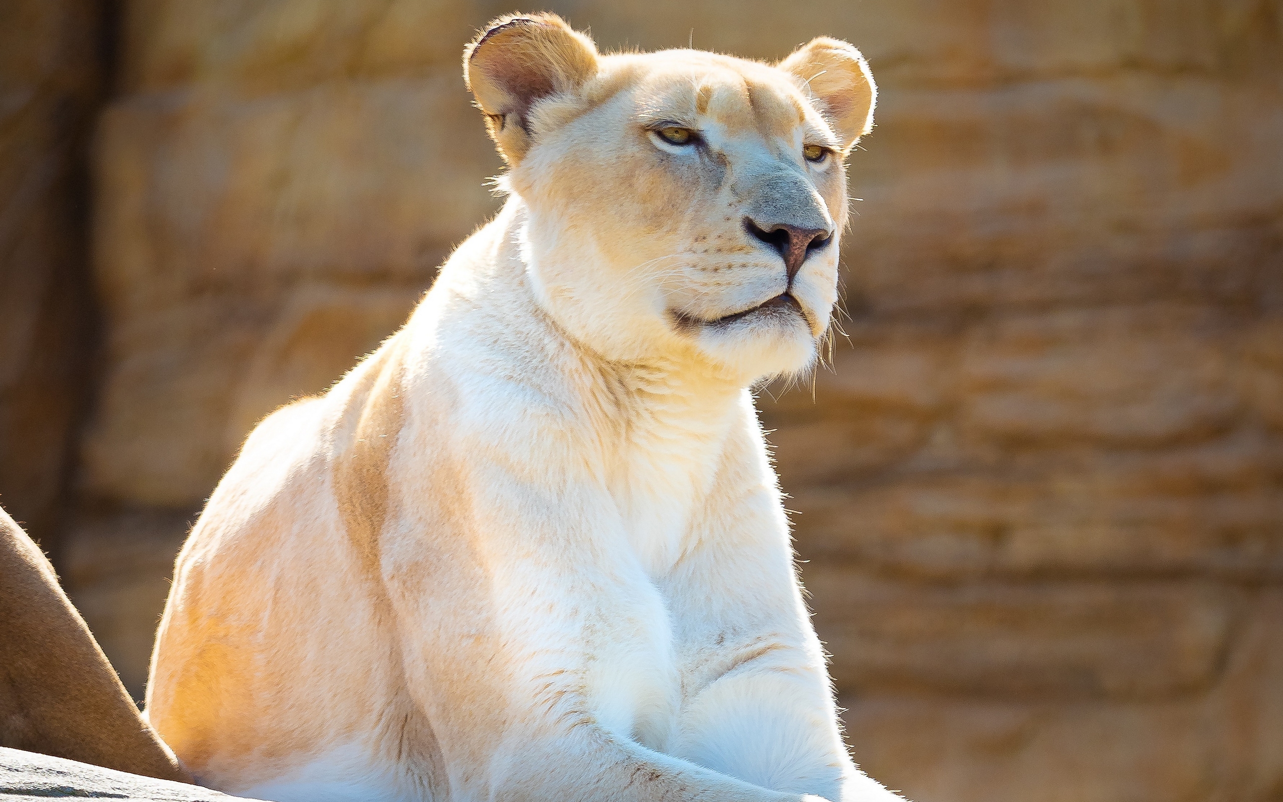 Description: A white tiger sitting on top of a rock next to a wall of rocks and a rock wall behind it.