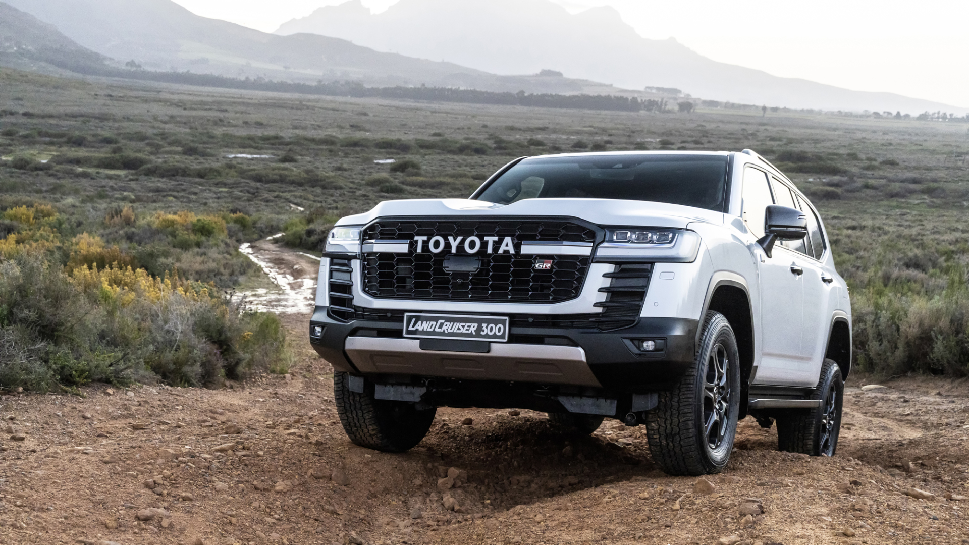 Description: A white toyota truck driving on a dirt road in the mountains with a stream of water behind it and a mountain range in the background.