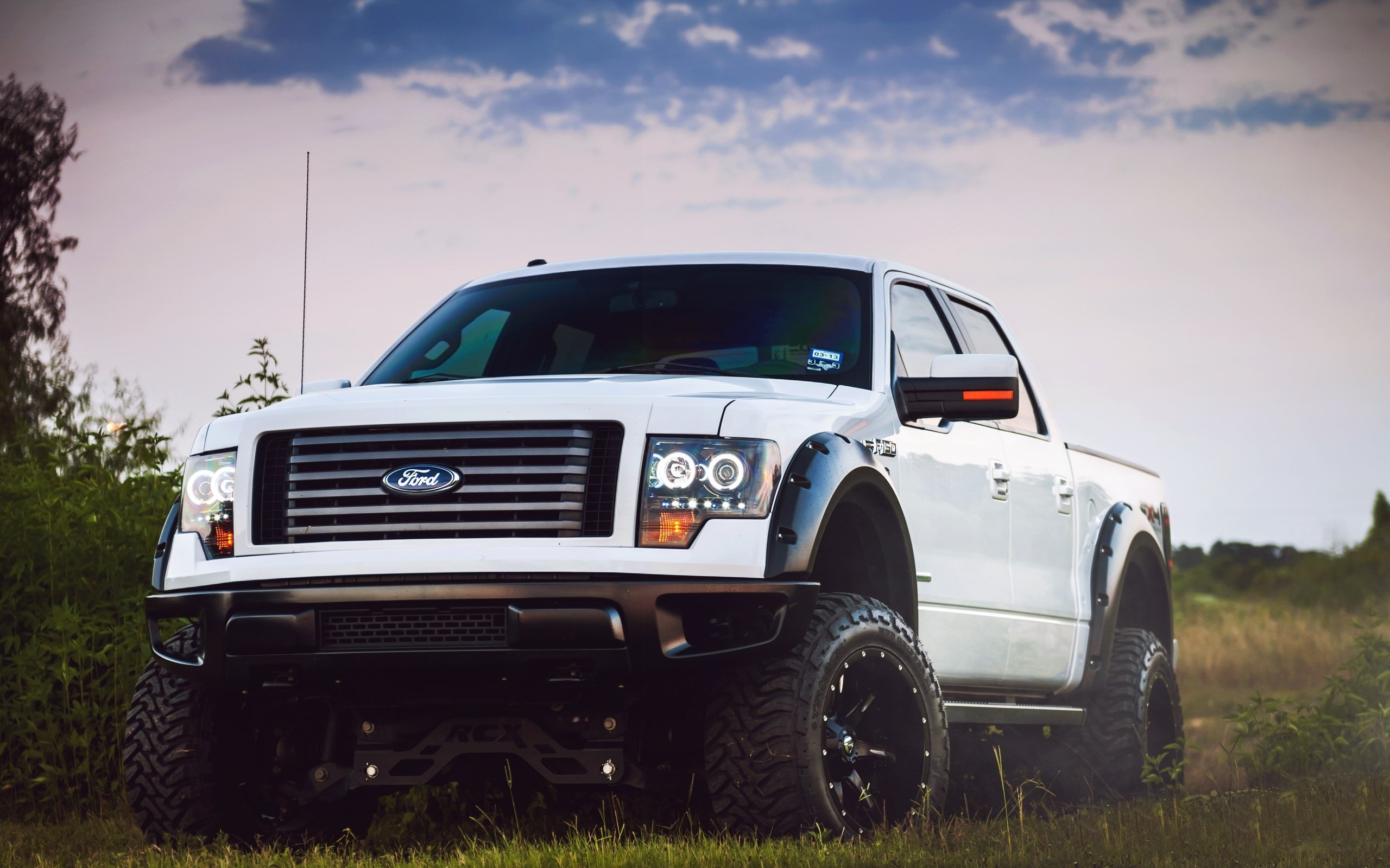Description: A white truck parked in a field with trees in the background and a blue sky with clouds in the background.