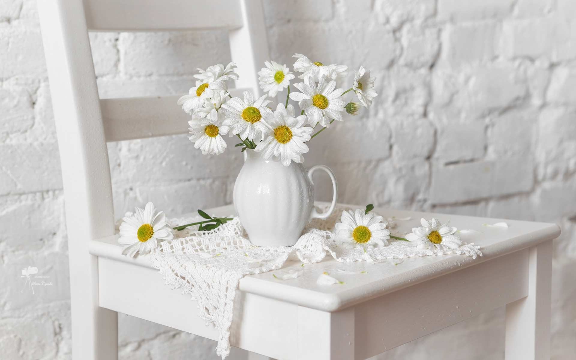 Description: A white vase with daisies on a white table cloth on a white chair against a brick wall with a white brick wall.