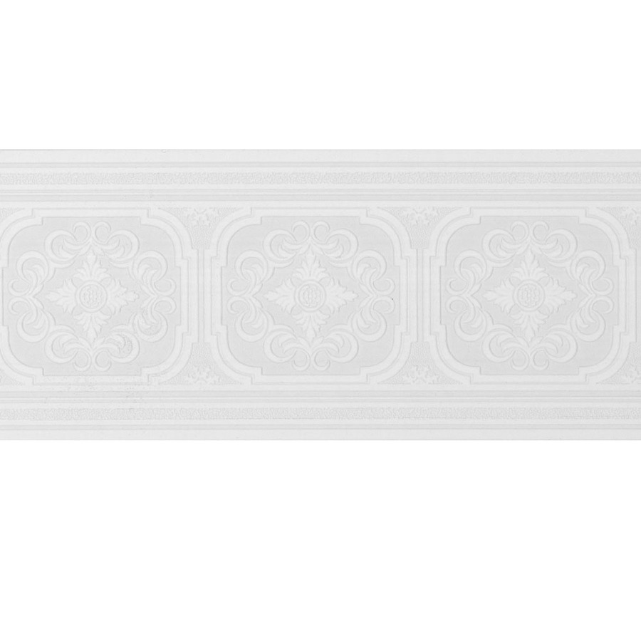Description: A white wall with a decorative design on it's side and a white background with a white border.