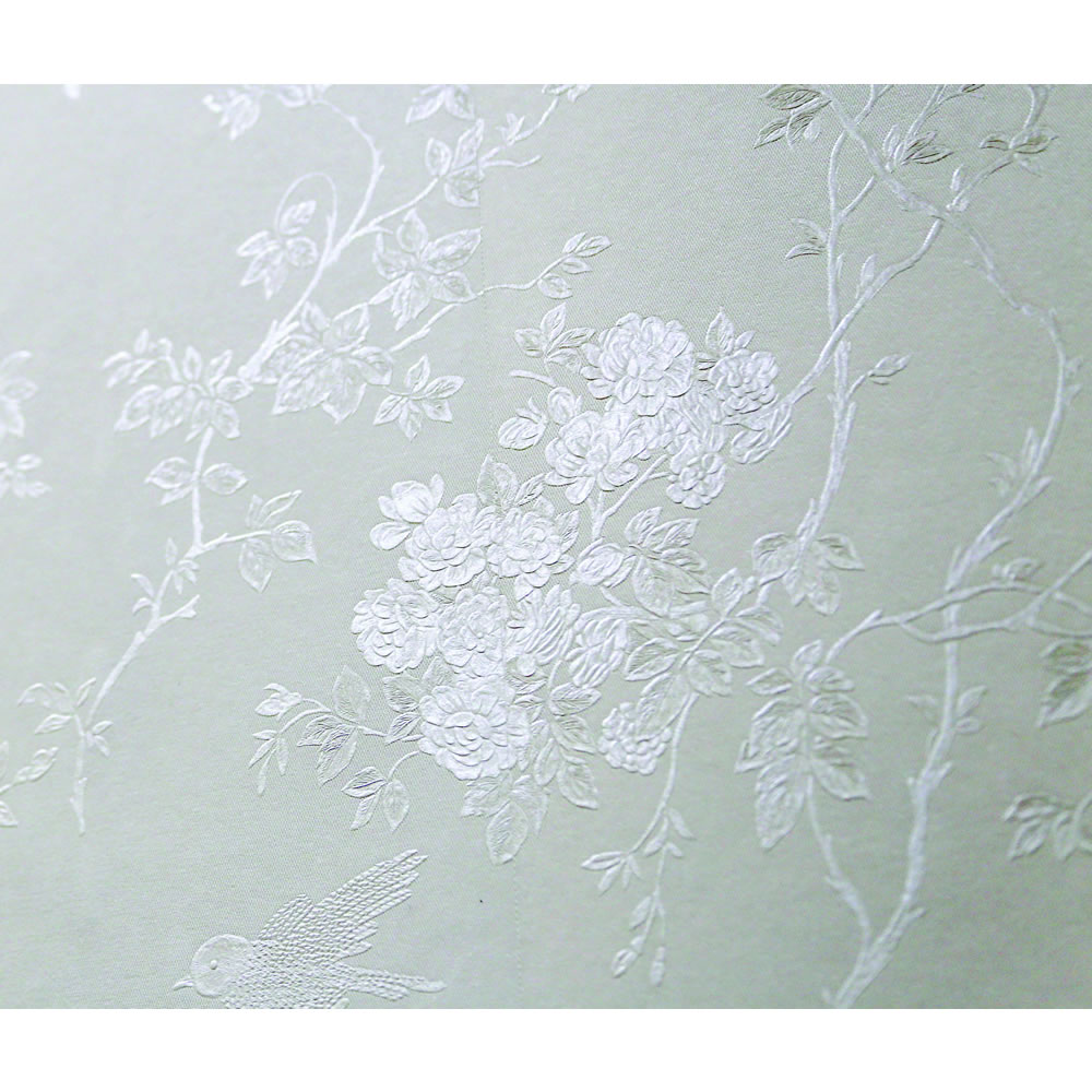 Description: A white wall with a flower pattern on it and a bird on the wall next to it and a clock.