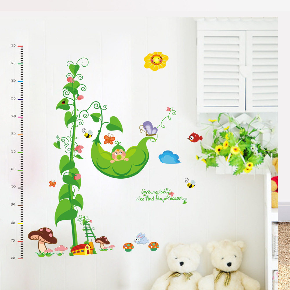 Description: A white wall with a green plant and a white teddy bear sitting on it and a growth chart behind it.
