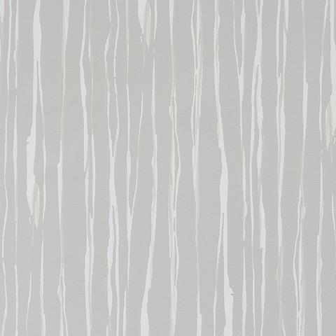 Description: A white wall with a white and grey striped pattern on it and a white vase with a white flower.