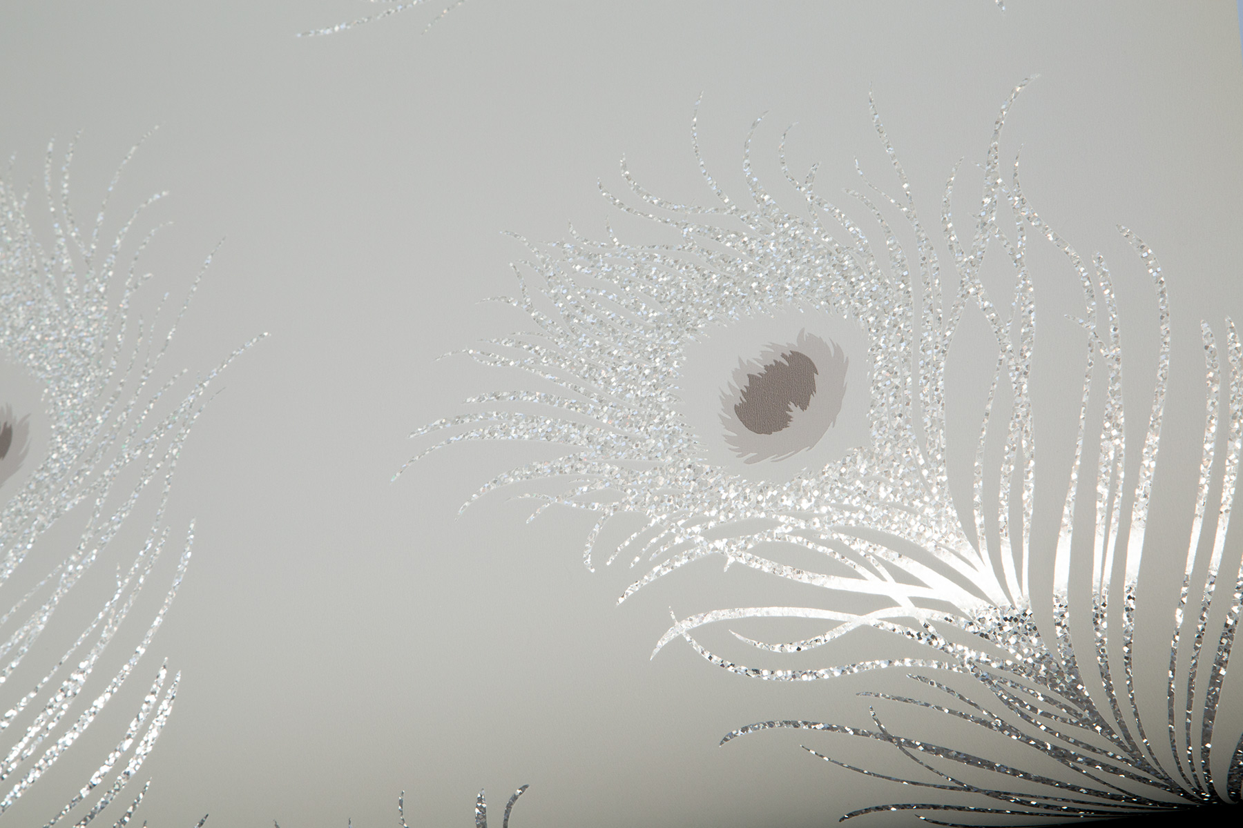 Description: A white wall with a bunch of water drops on it and a black and white picture of a peacock.