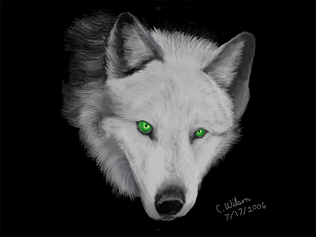 Description: A white wolf with green eyes and a black background with the words southern wildness written below it and a black background with the wolf's name.