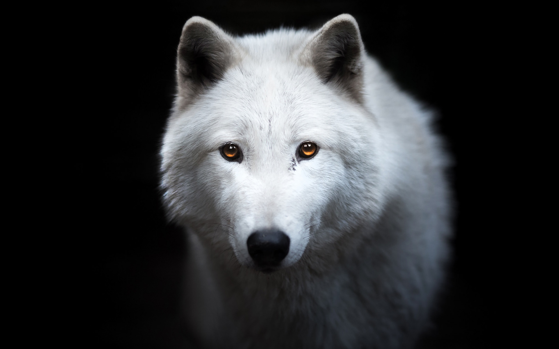 Description: A white wolf with orange eyes looking at the camera with a black background and a black background with a white wolf.