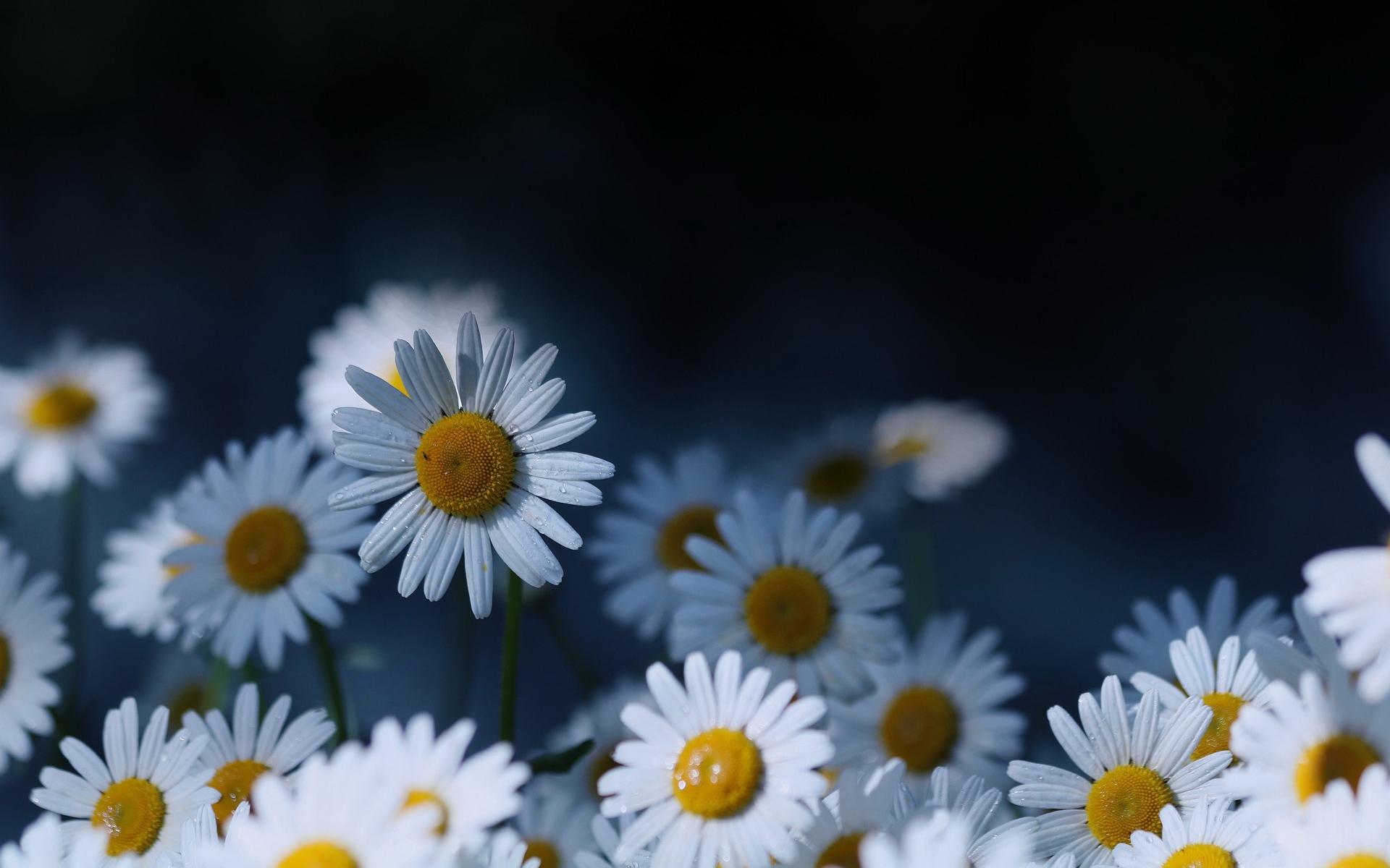 Description: A bunch of white and yellow flowers with a black background in the background.
