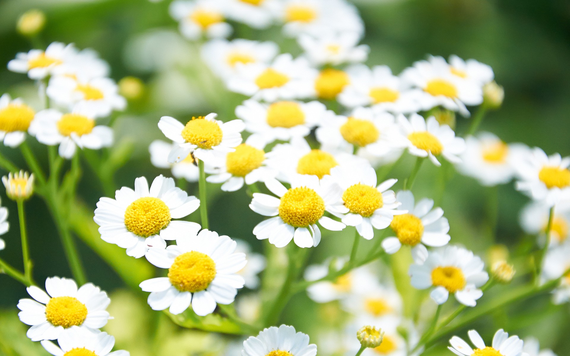 Description: A bunch of white and yellow flowers in a field of grass and flowers in the background are blurry.