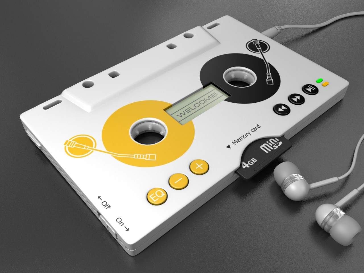 Description: A white and yellow mp3 player with headphones on it's side and a black and white background.
