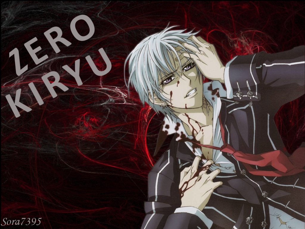Description: A man with white hair and a black jacket with a red tie and a red background with the words zero kiryu.