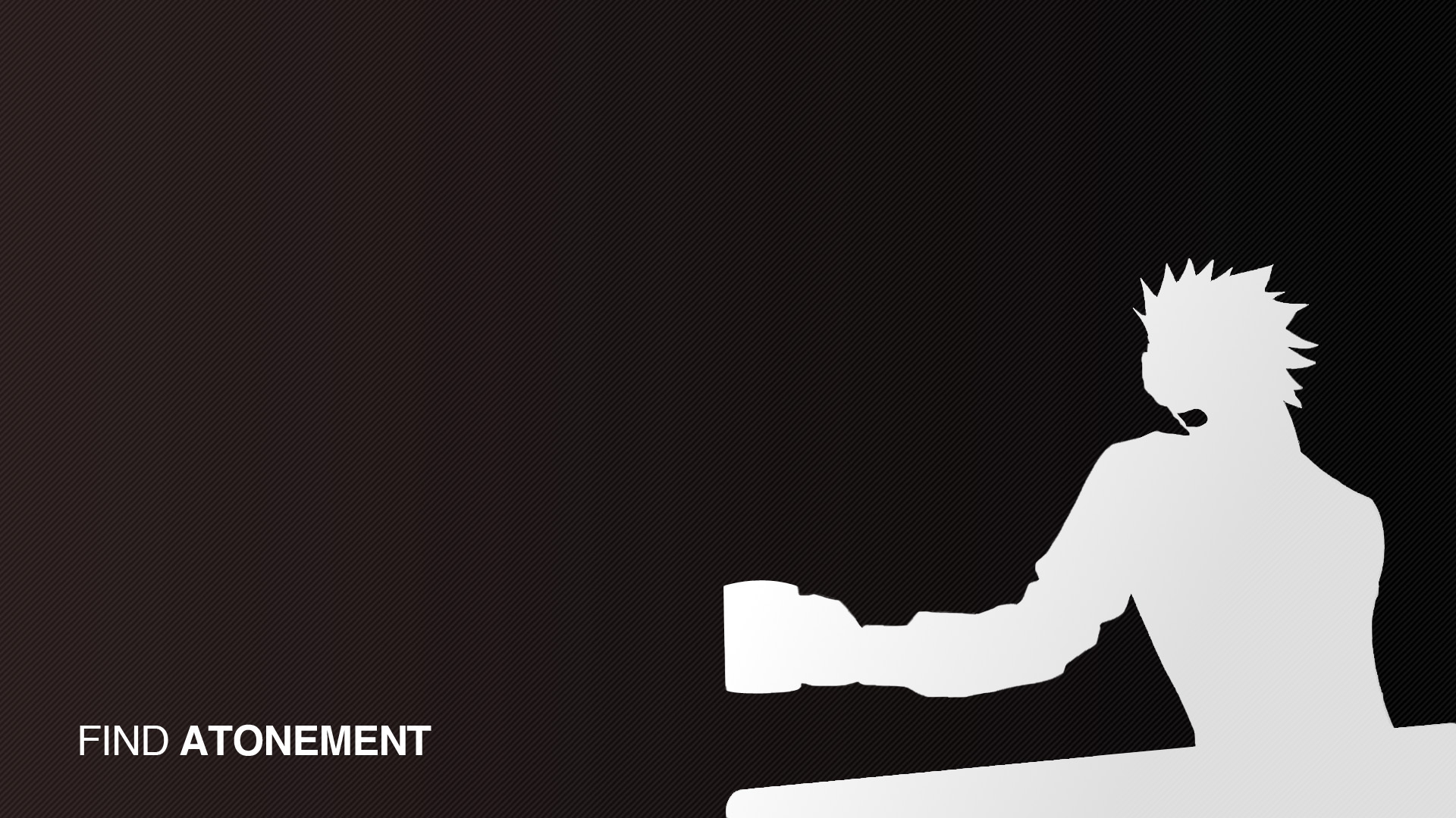 Description: A man with a white hair and a black shirt is holding a white object in his hand and the words find atonement.