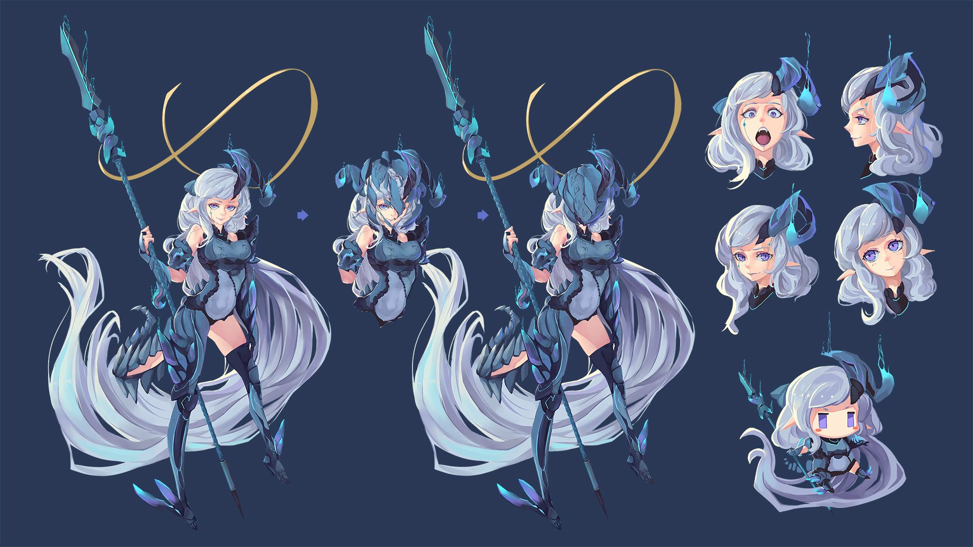 Description: A character sheet of a woman with white hair and blue eyes holding a sword and a staff with a long tail.