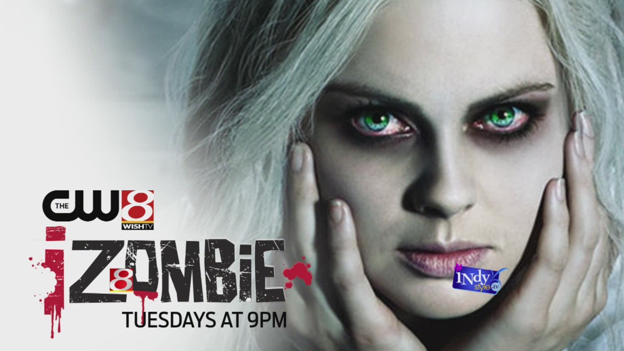 Description: A woman with white hair and green eyes holding her hands to her face with a zombie theme on it.