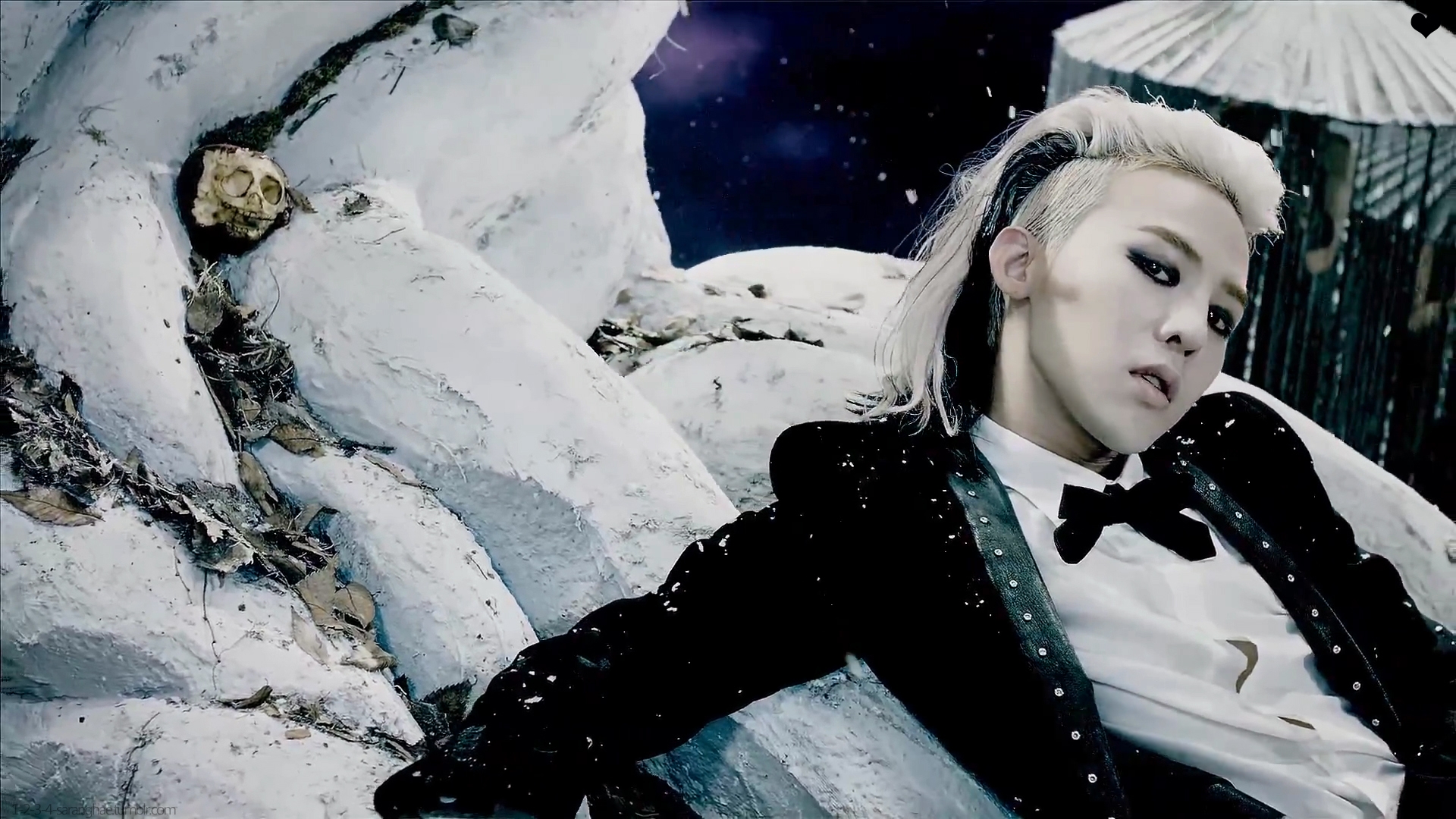 Description: A woman with white hair and black clothes sitting on a rock in the snow with a umbrella in the background.