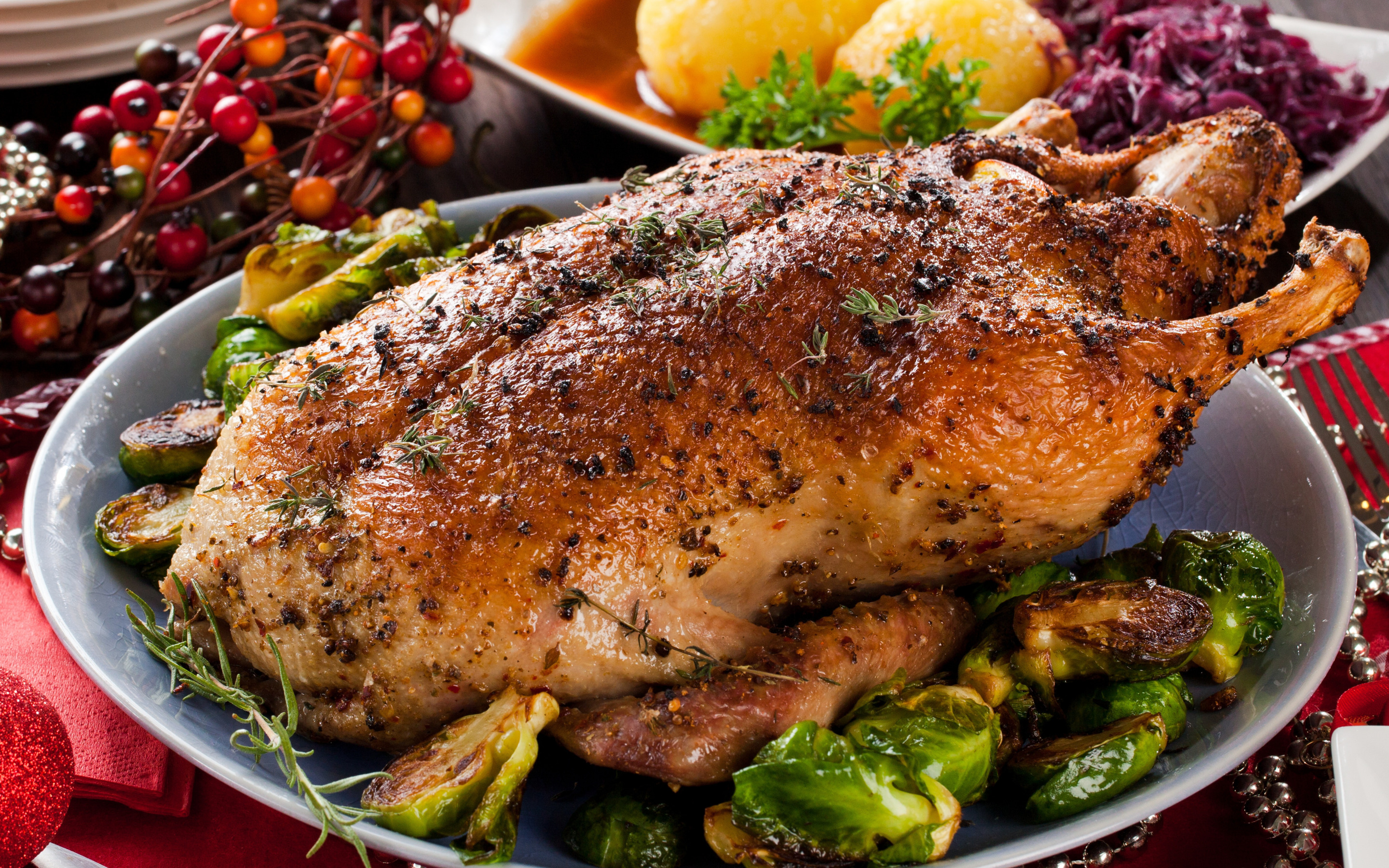 Description: A plate of food with a whole chicken and vegetables on it and a red napkin on the side of the plate.