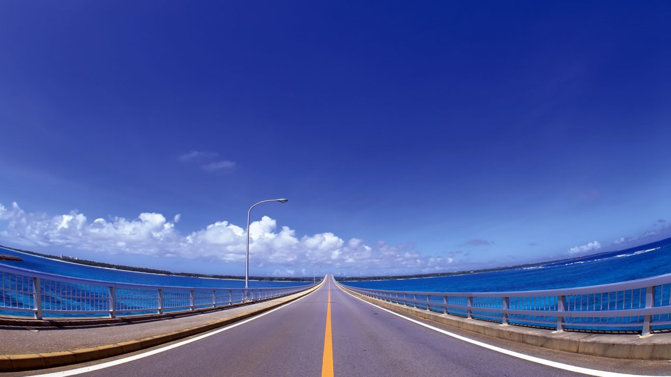 Description: A wide open road with a street light on the side of it and a blue ocean in the background.