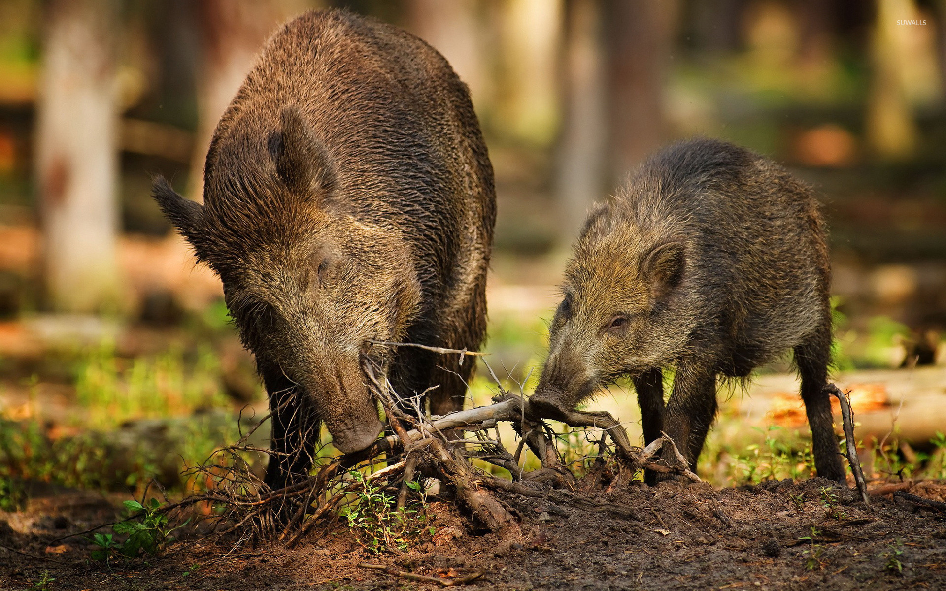 Description: Two wild boars are eating grass in the woods together.