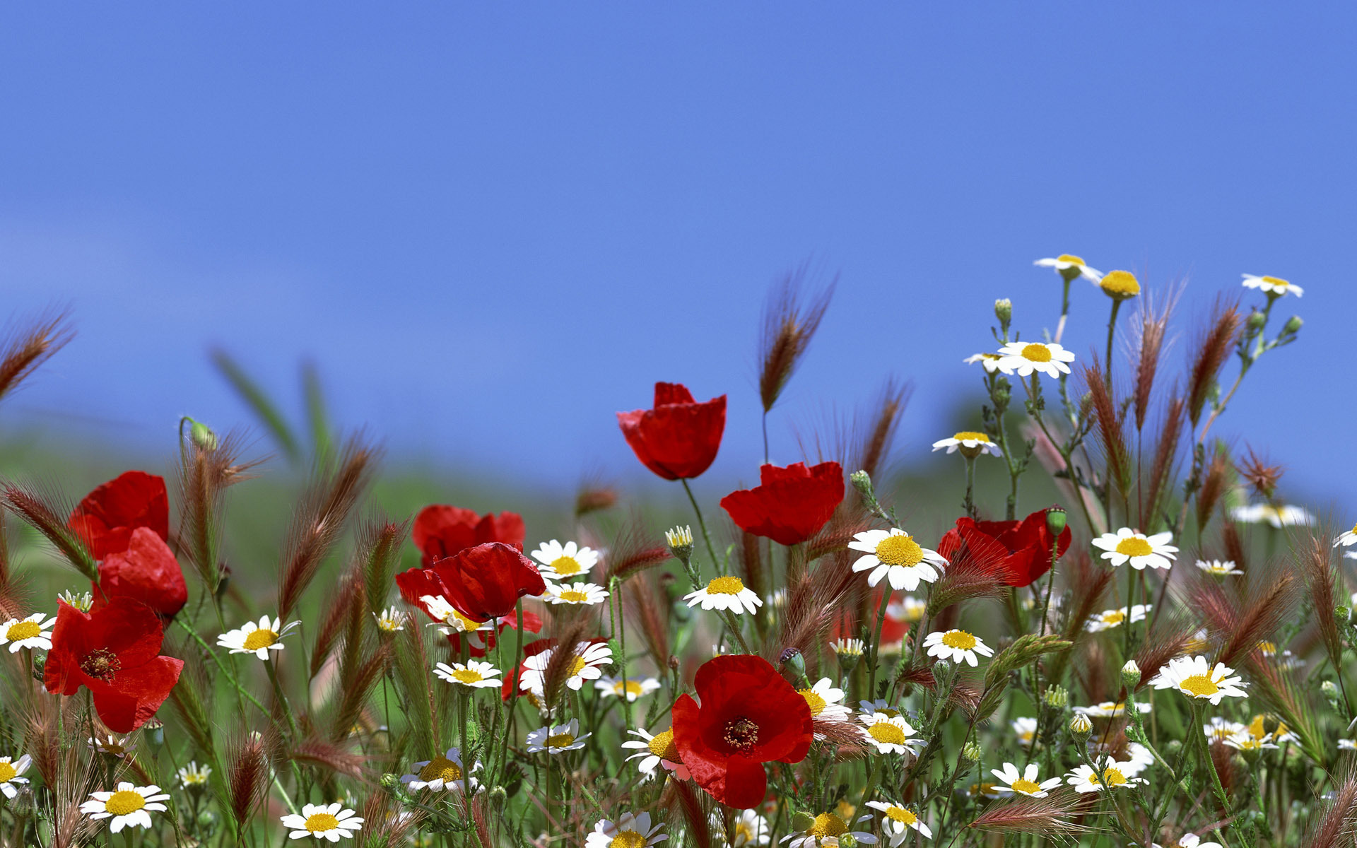 Description: A field of wildflowers and daisies with a blue sky in the background.