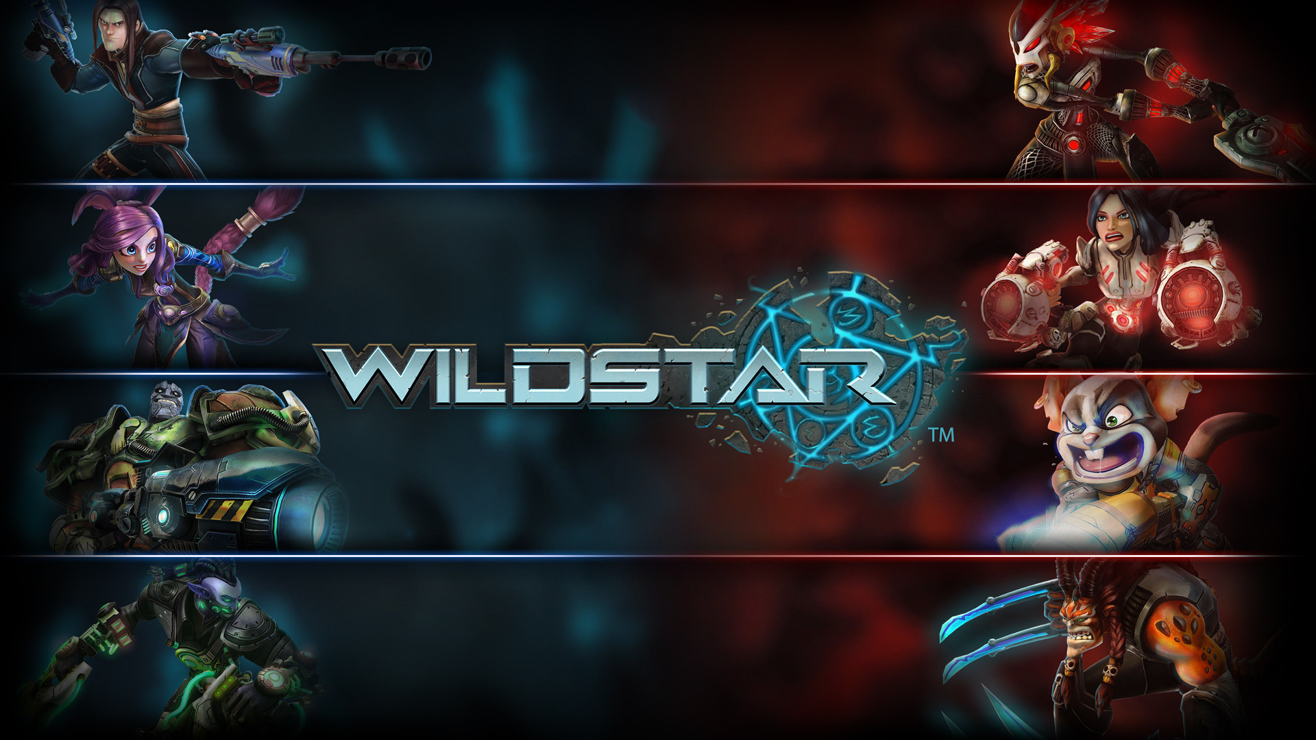 Description: A series of wildstar characters with a dark background and a red and blue background with the words wildstar.