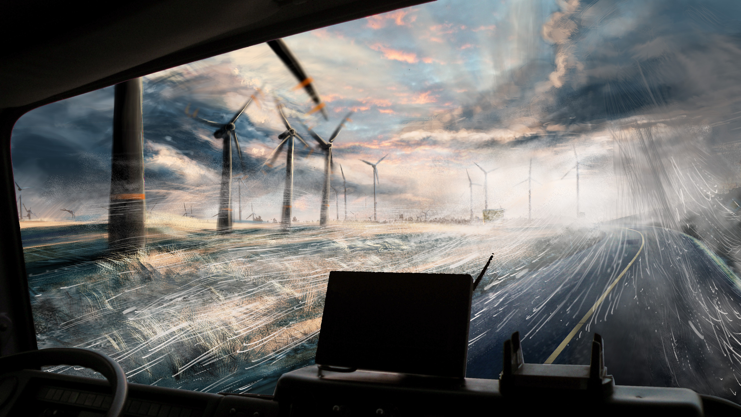 Description: A painting of a wind farm and a highway with a laptop on the dashboard of a vehicle in the foreground.