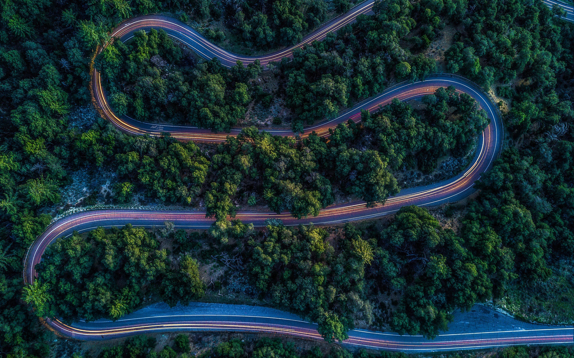 Description: A winding road in the middle of a forest with a lot of trees around it and a few cars on the road.