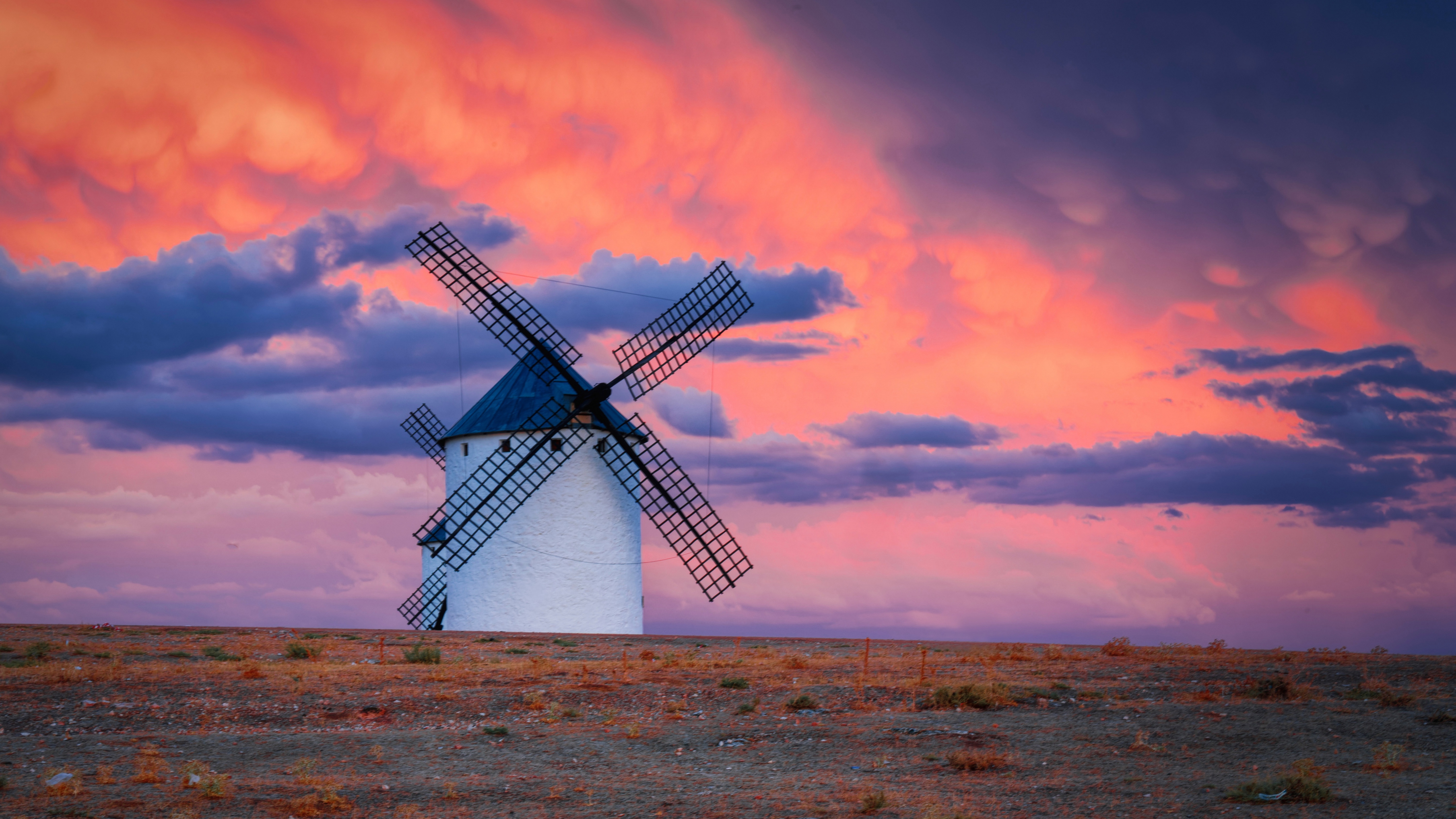 Description: A windmill in a field with a pink sky in the background and clouds in the foreground.