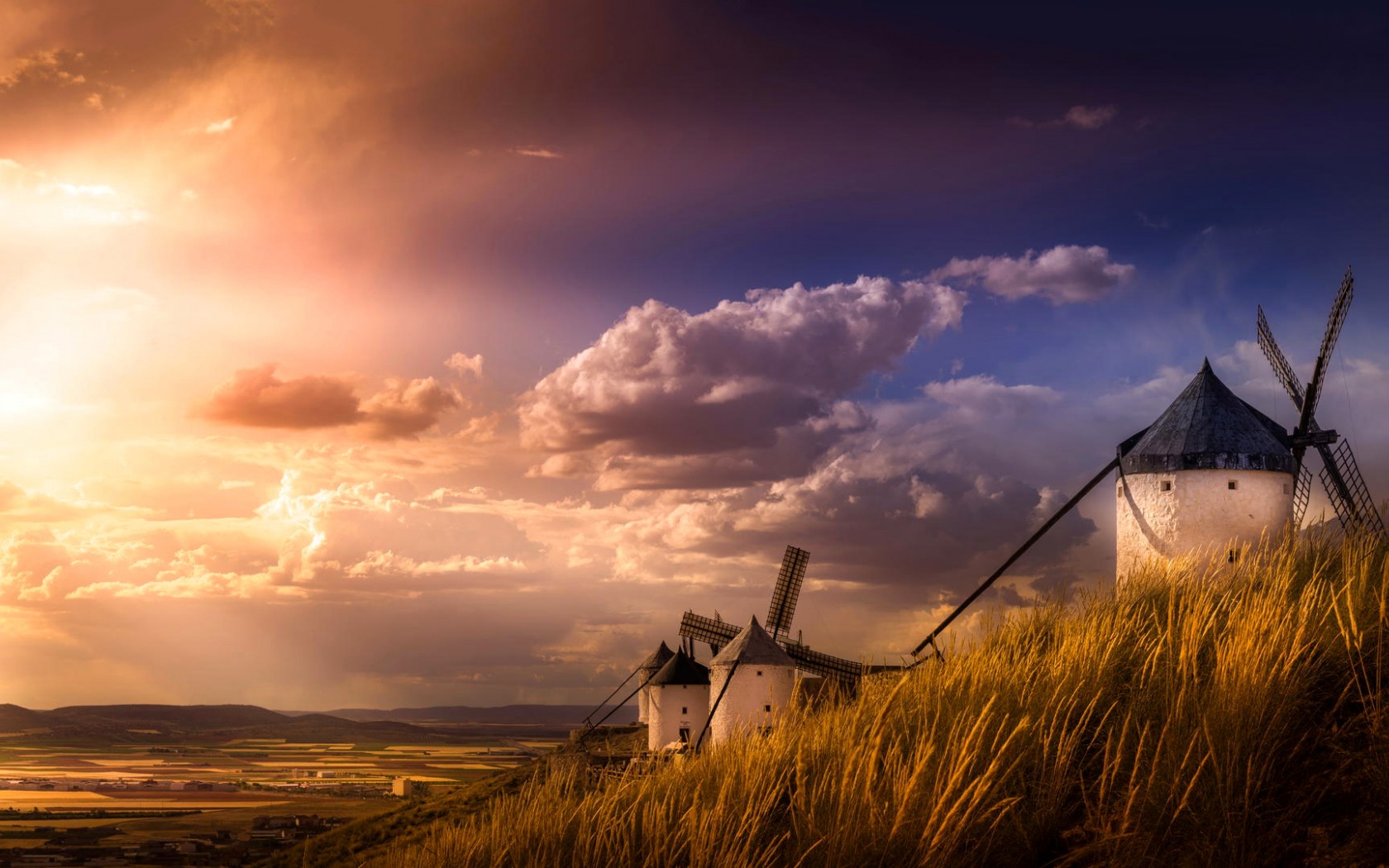 Description: A windmill on a hill with a sunset in the background and clouds in the sky above it.