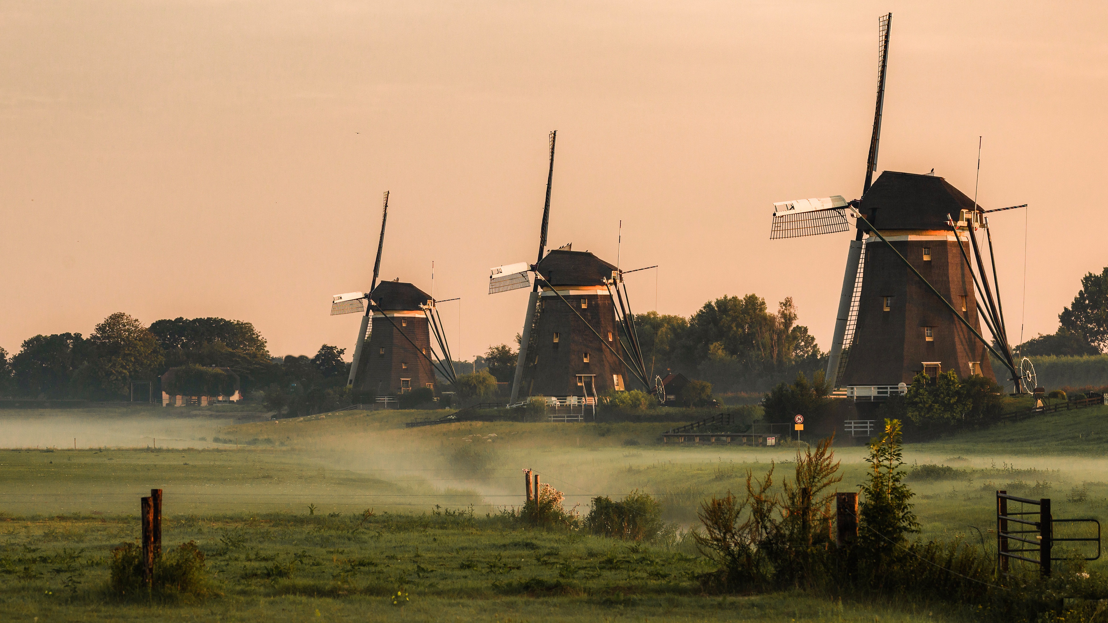 Description: A group of windmills in a field with fog in the air and trees in the background.
