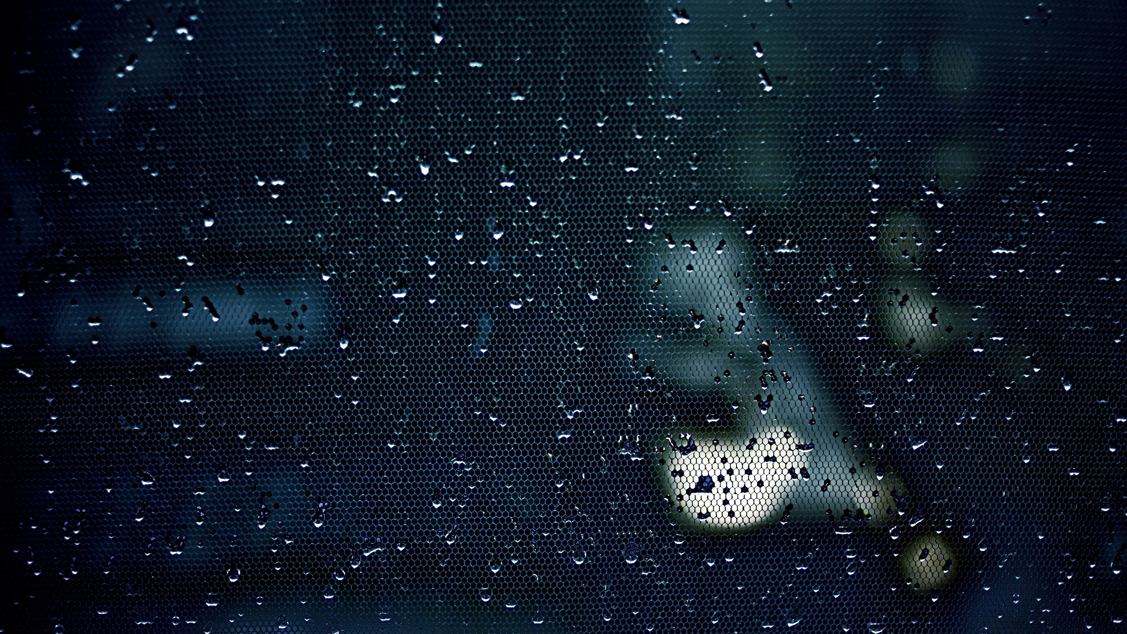 Description: A window with rain drops on it and a person in the background looking out the window at the rain.