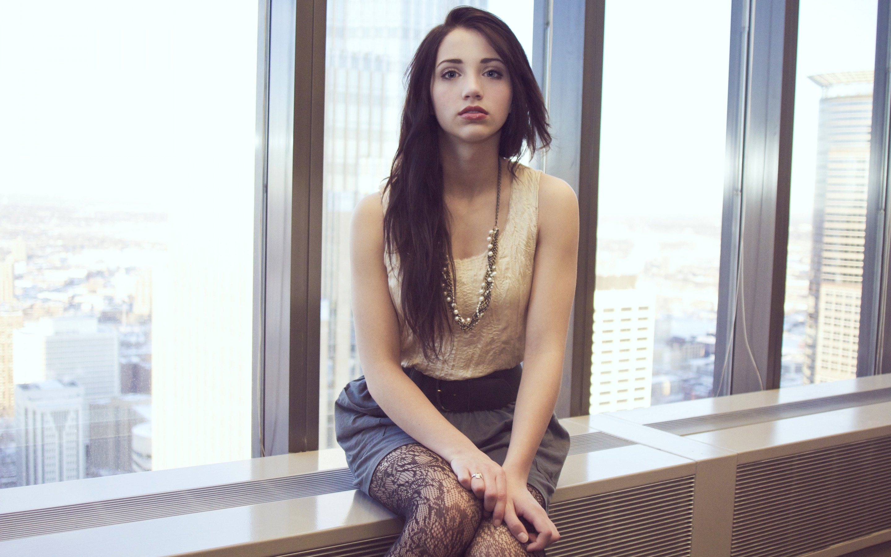 Description: A woman sitting on a window sill in a room with a view of a city and skyscrapers.