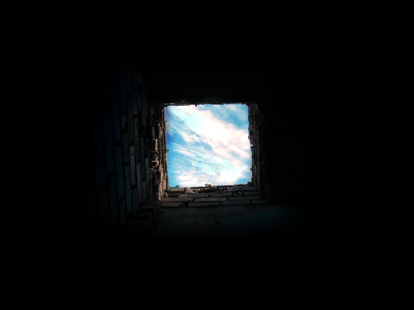 Description: A window in a wall with a sky in the background and a sky in the middle of the window.