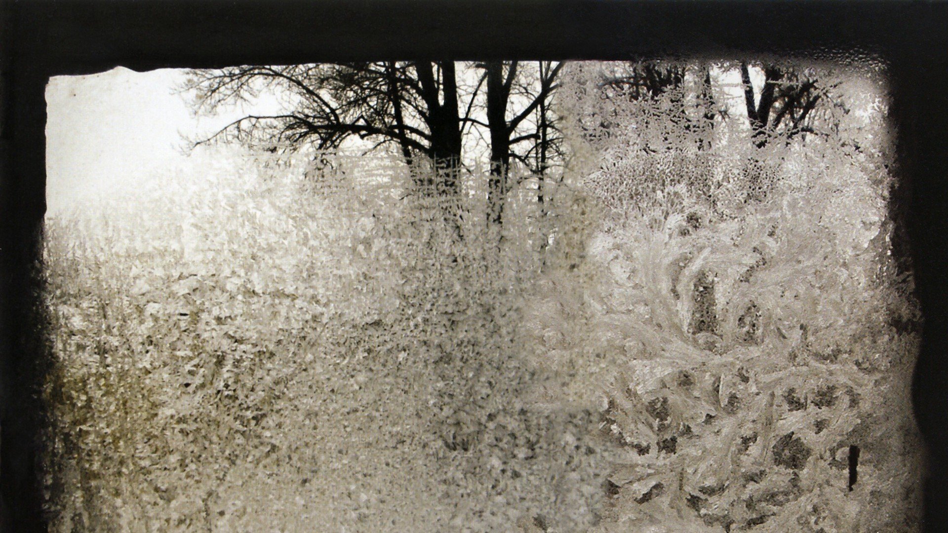Description: A window with a tree outside of it and a tree outside of it with snow on the window sill.