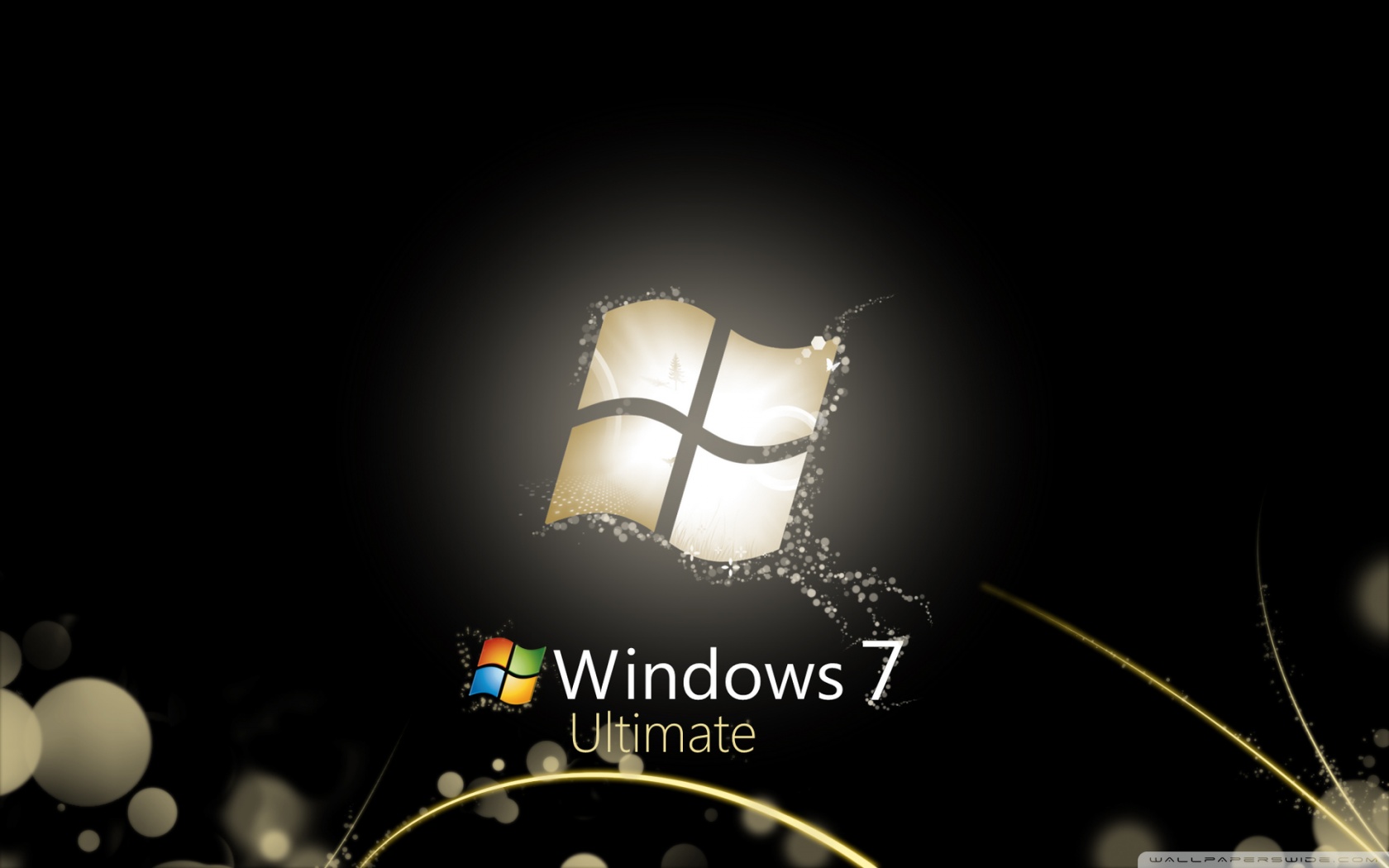 Description: A black background with a windows 7 logo on it and a gold swirl around it and a black background with a white and yellow logo.
