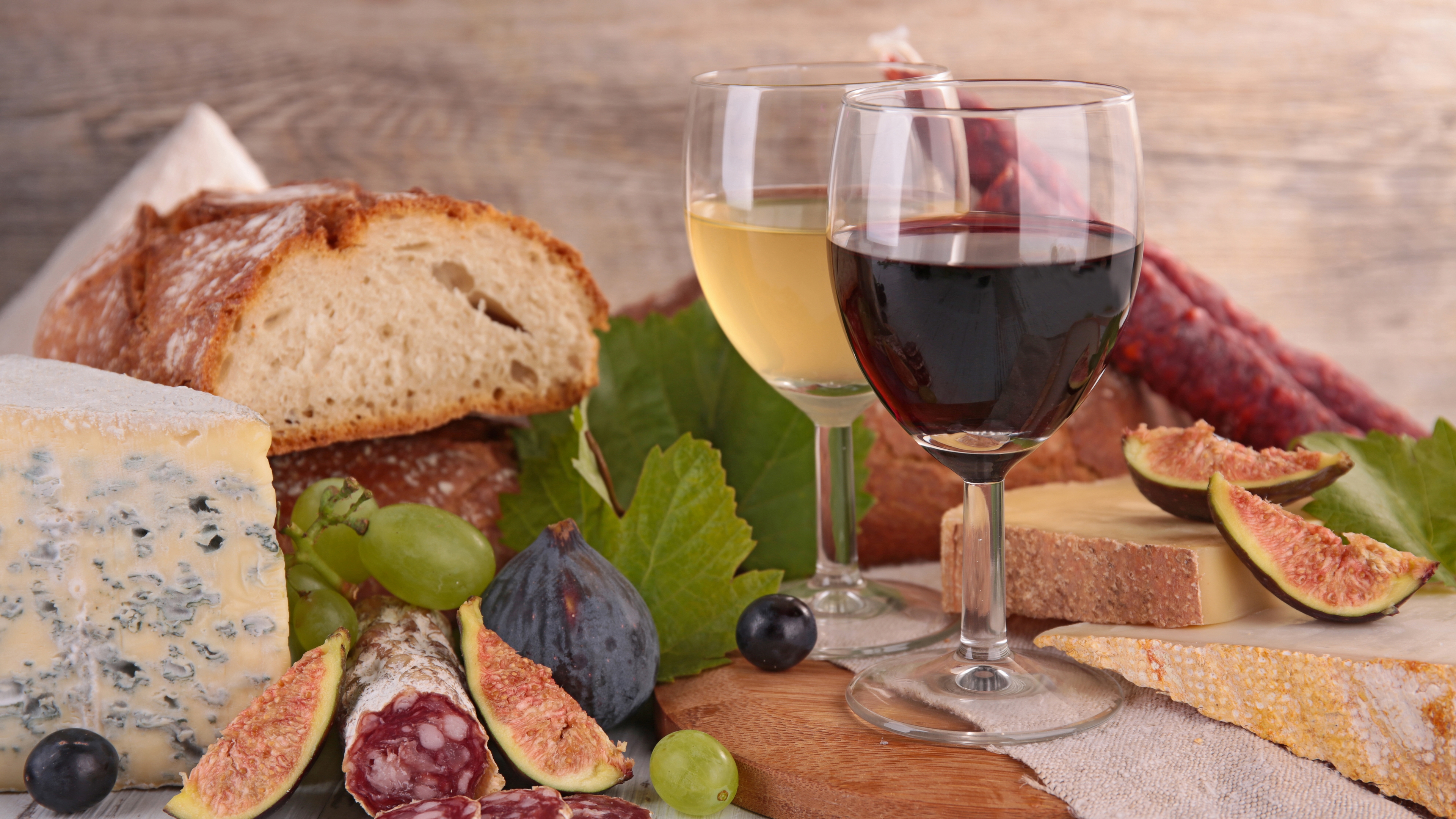 Description: A glass of wine and some bread and grapes on a table with a knife and some bread slices and grapes.