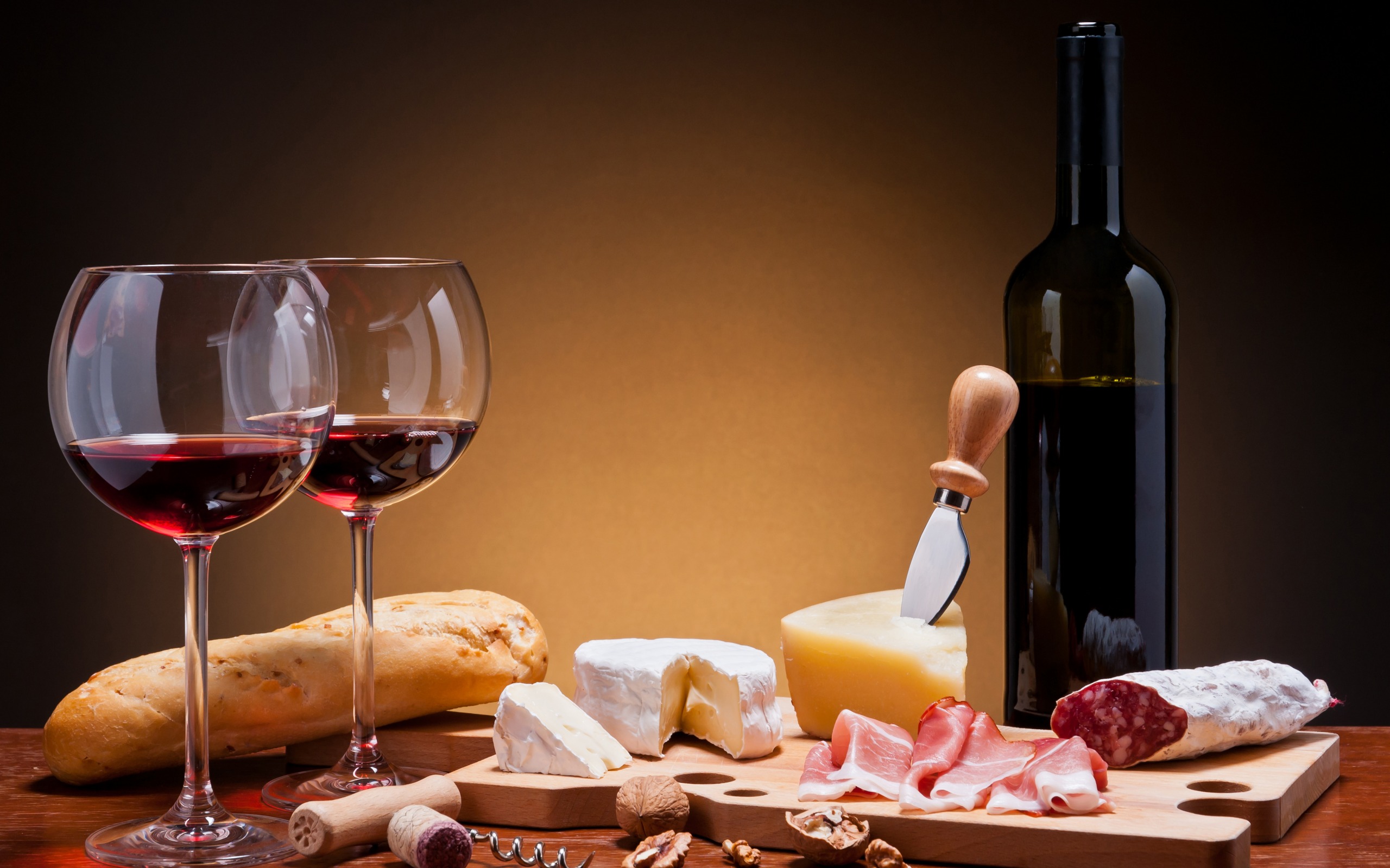 Description: A wine glass and a bottle of wine and some cheese and meats on a table with a corkscrew.