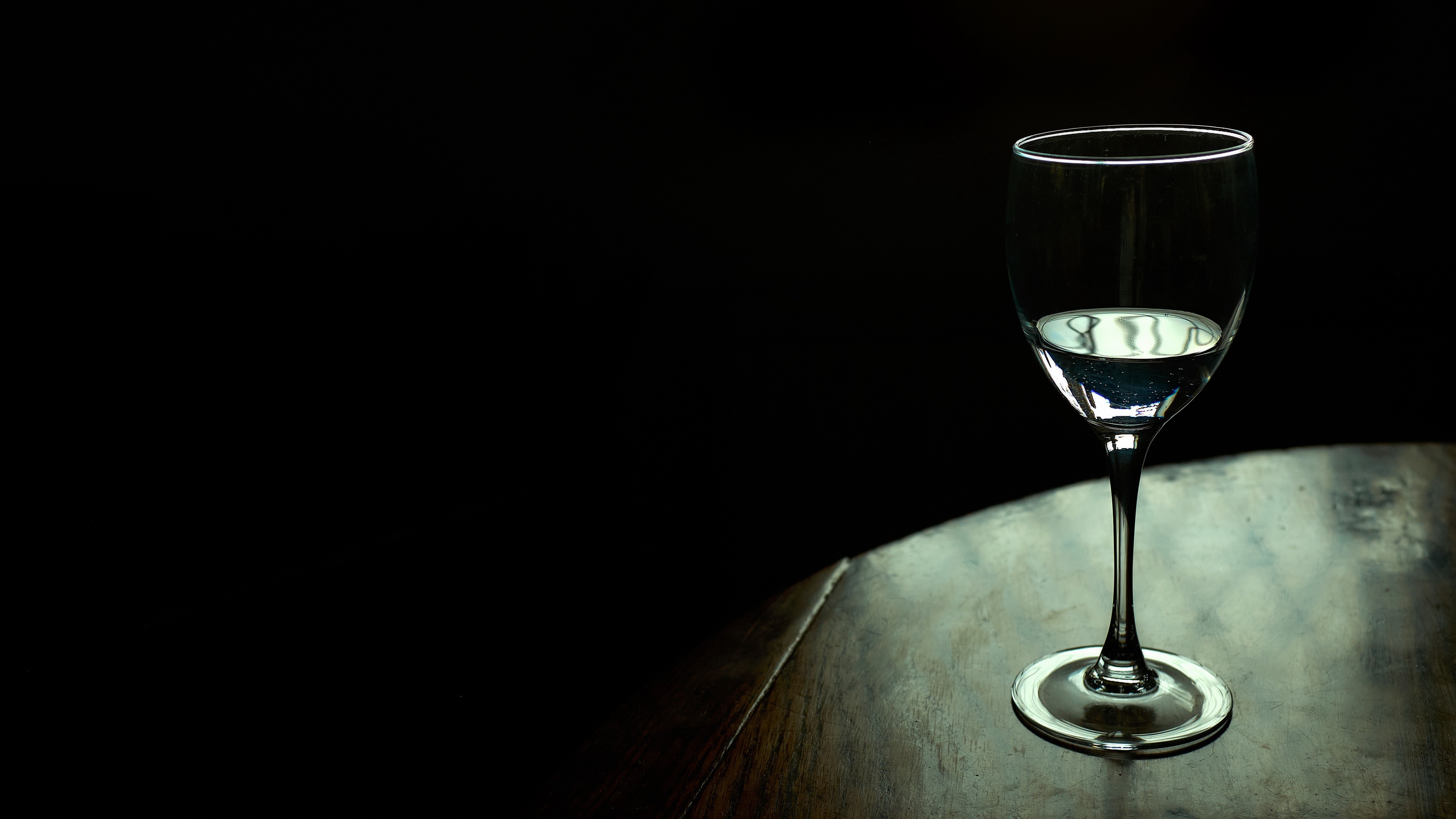 Description: A glass of wine sitting on a table in the dark with a reflection of the wine glass in the glass.