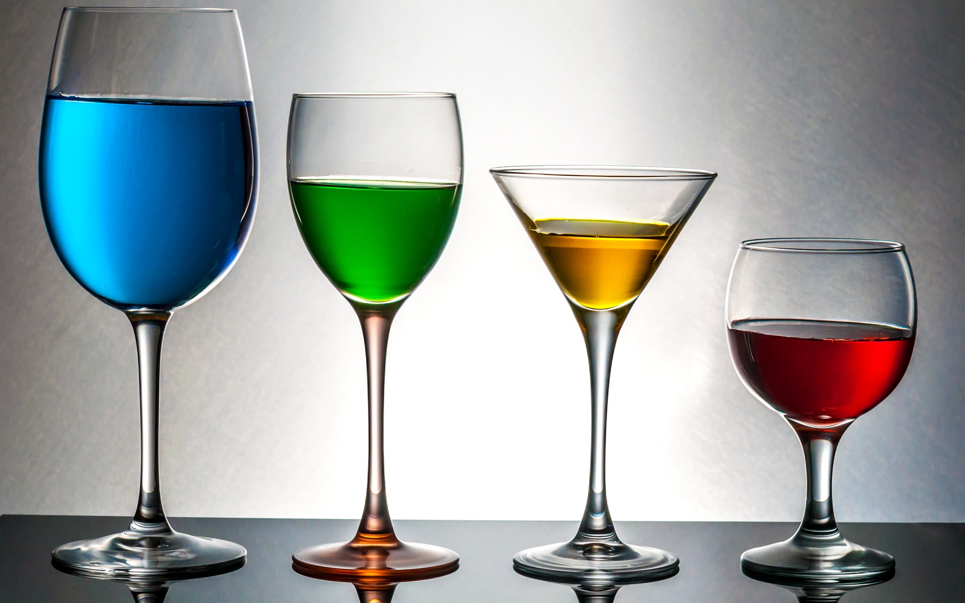 Description: A row of different colored wine glasses on a table with a white background and a silver background behind them.