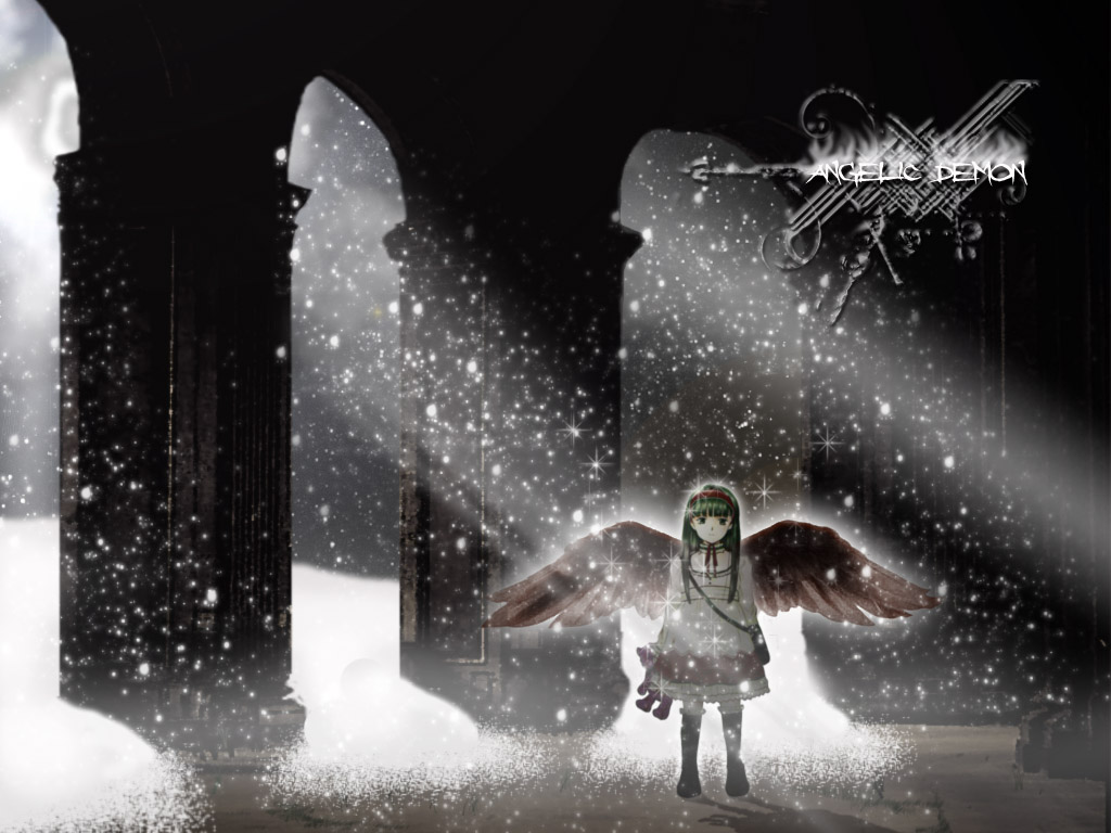 Description: A person with wings standing in a snowy area with a light shining on them and a building in the background.