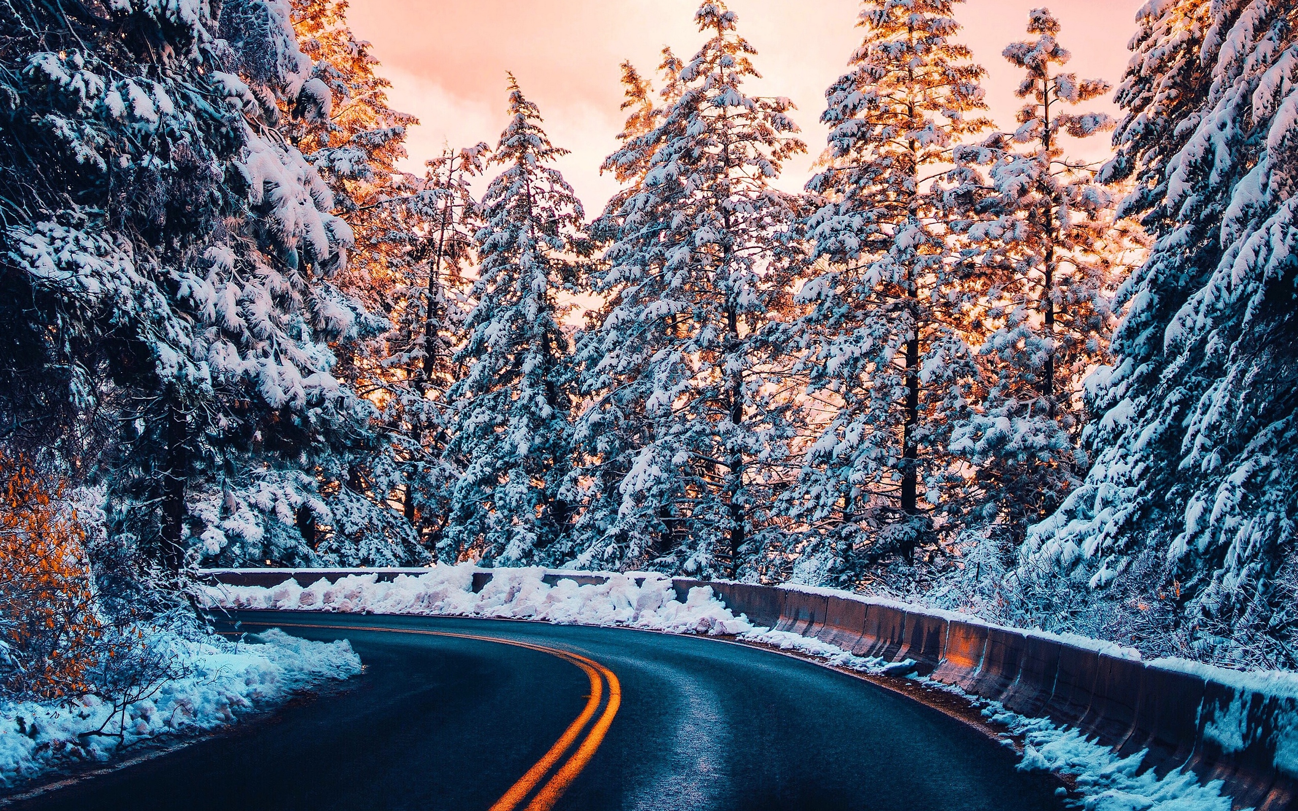 Description: A road with a line of trees on both sides of it and a sky background with clouds and snow.