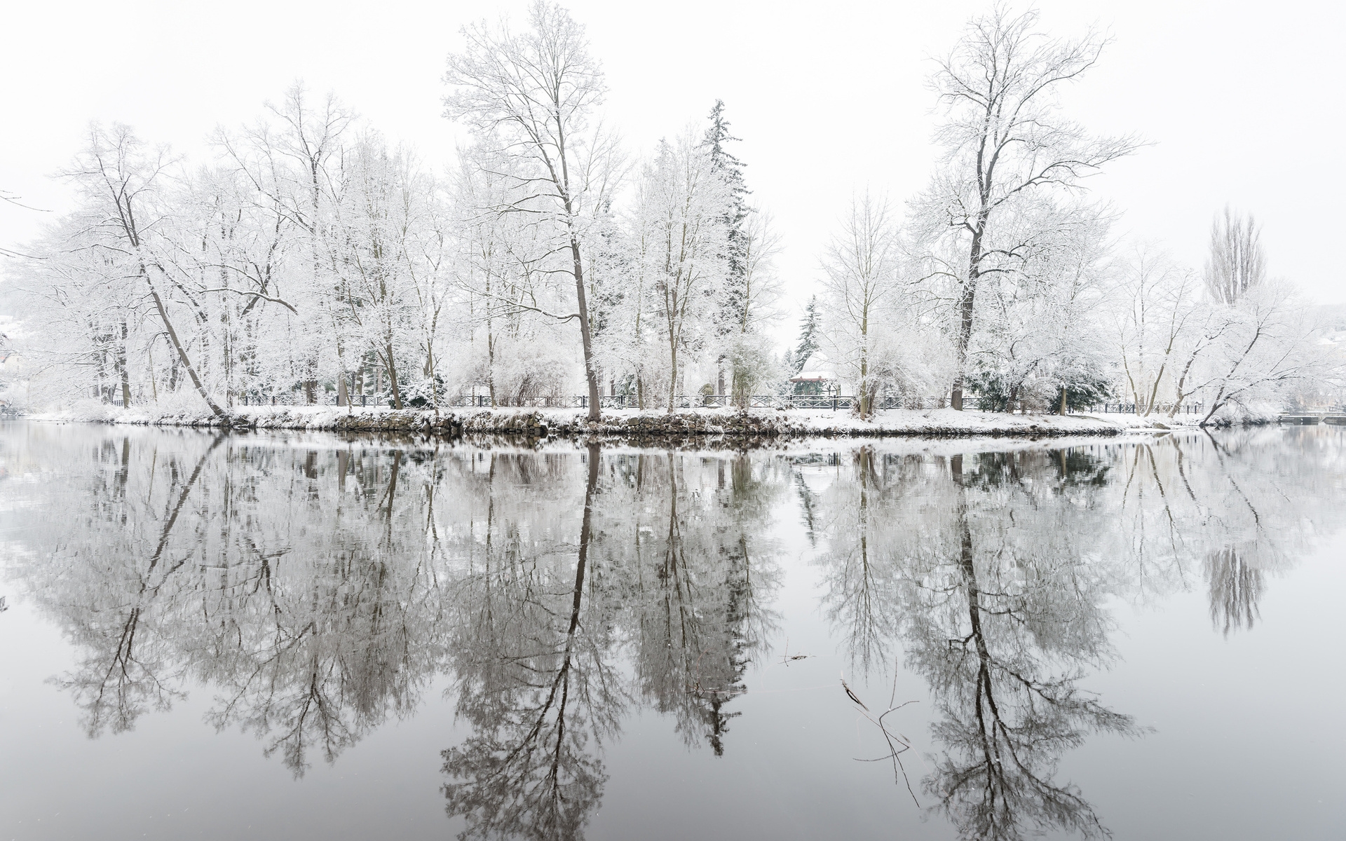 Description: A lake with trees and a house in the background covered in snow and ice with a few trees in the foreground.