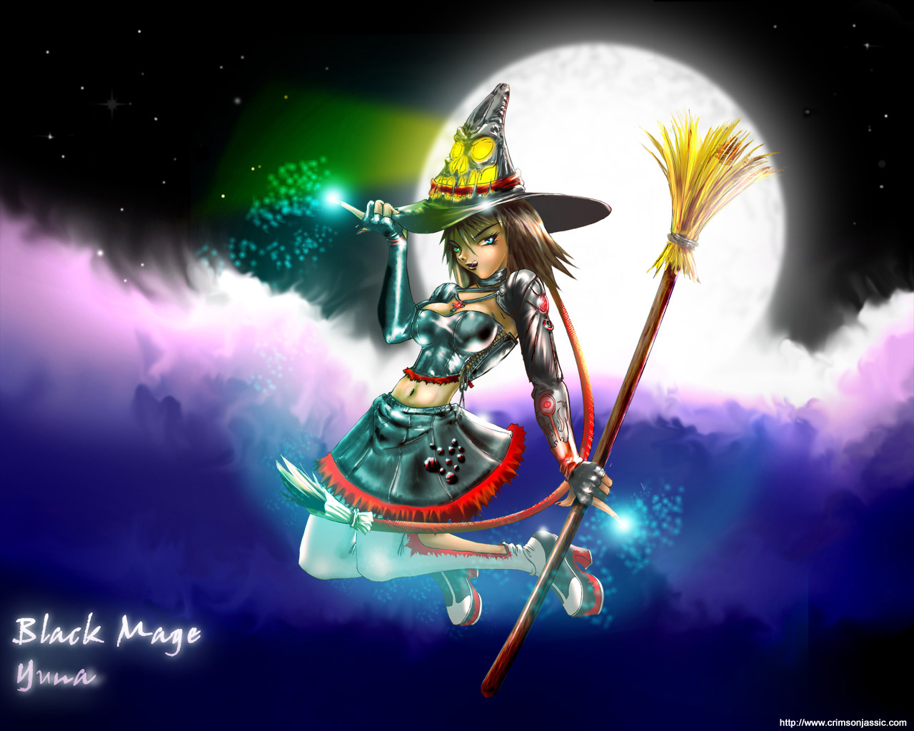 Description: A woman dressed in a witch costume holding a broom and a broomstick in her hand while standing on a cloud.