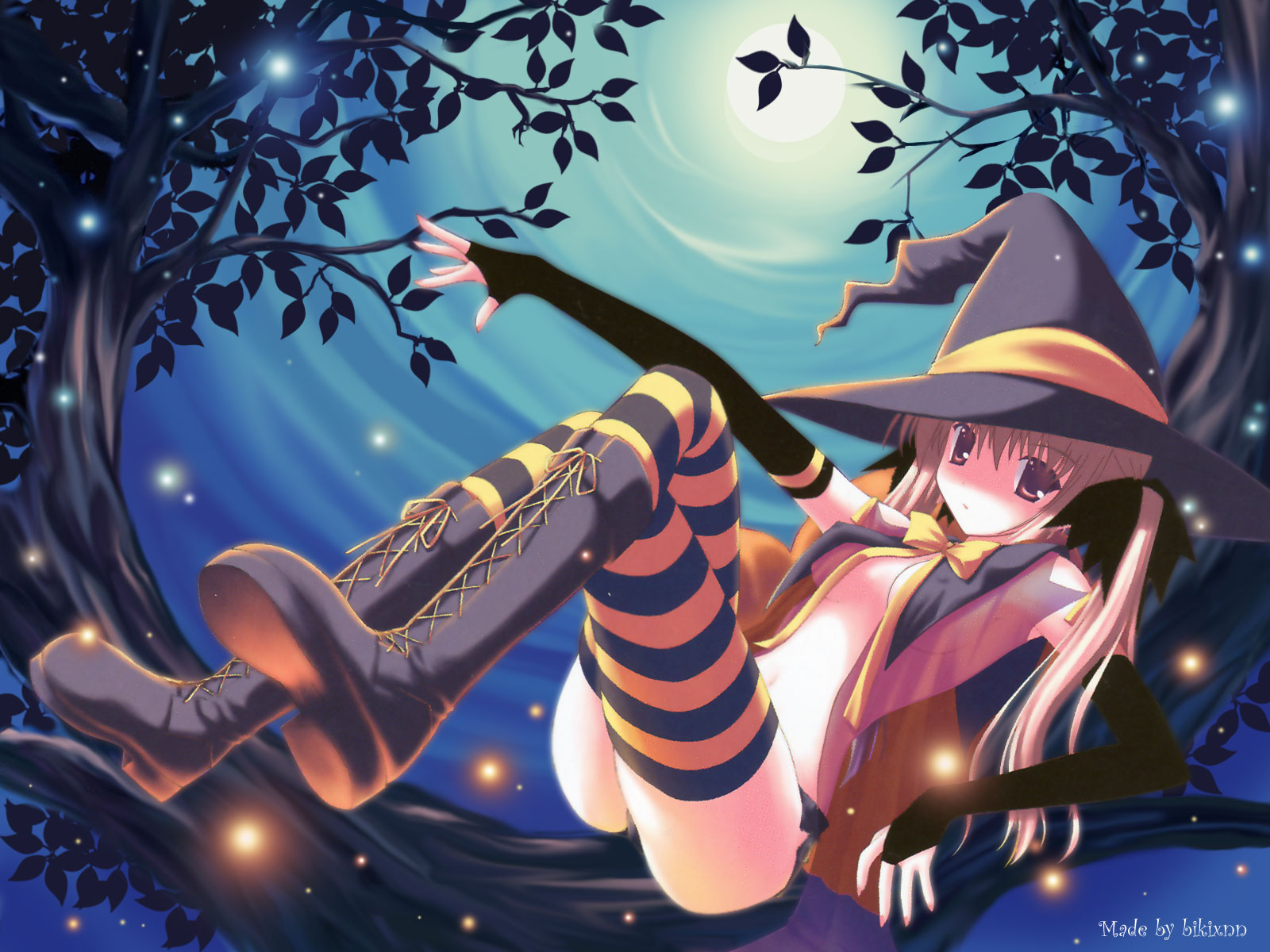 Description: A woman in a witch costume sitting on a tree branch with a broom in her hand and a full moon in the background.