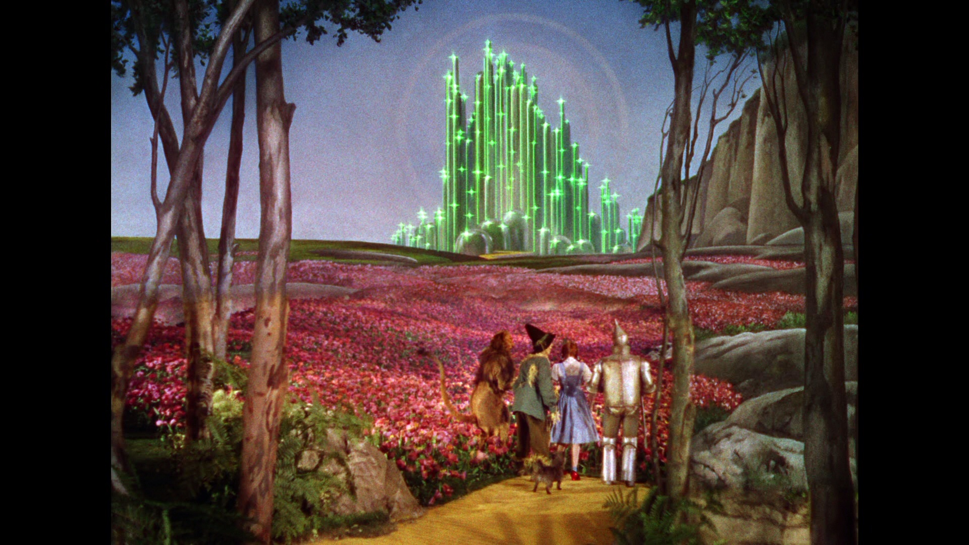 Description: A painting of a wizard's castle surrounded by flowers and trees with a yellow path leading to it.