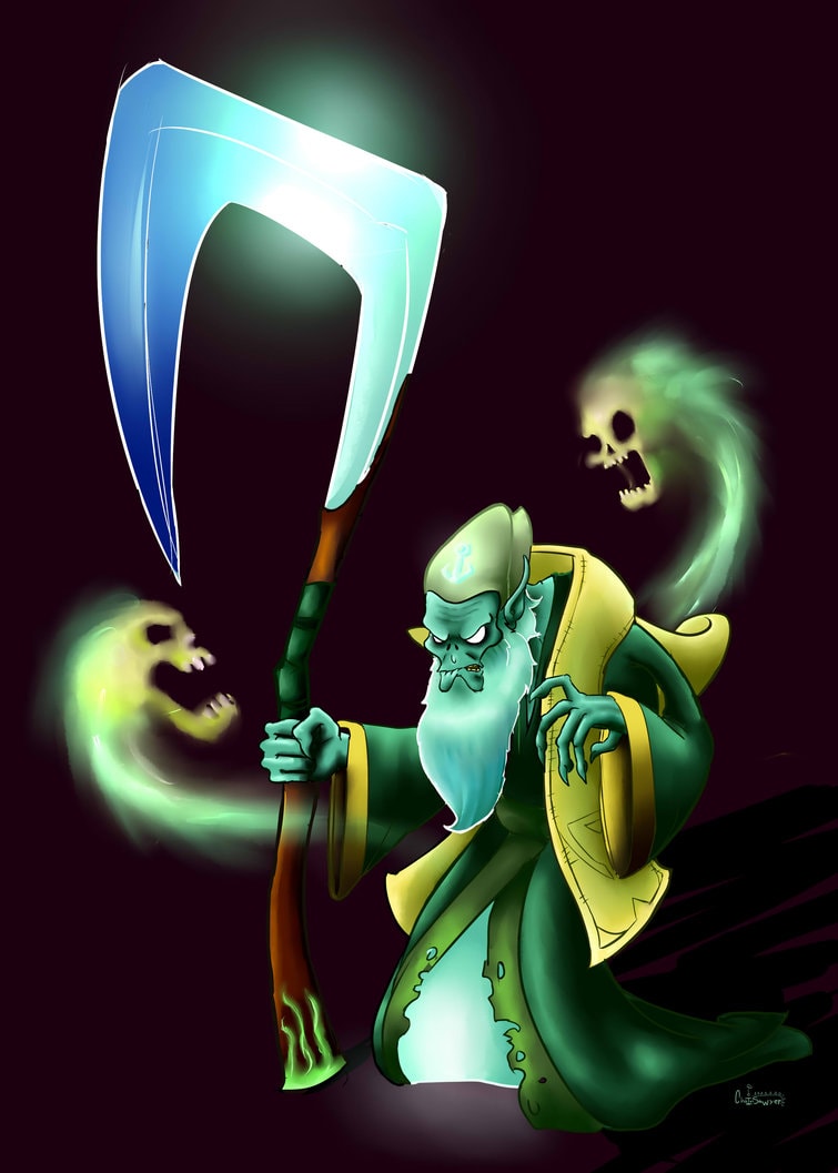 Description: A wizard with a scab and a scab sword in his hand and a skull in the background.