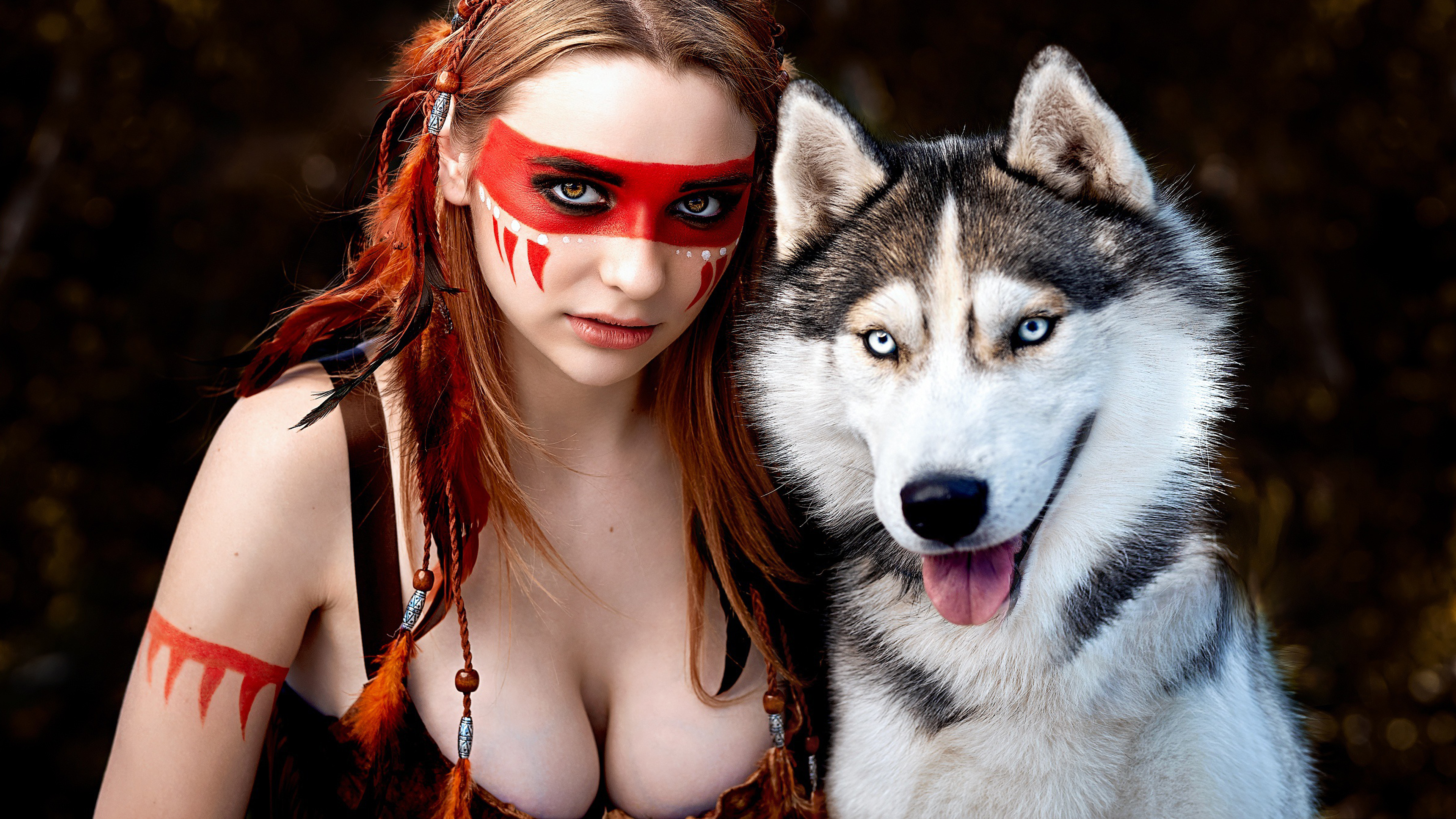 Description: A woman with a wolf face paint on her face and a wolf behind her face.