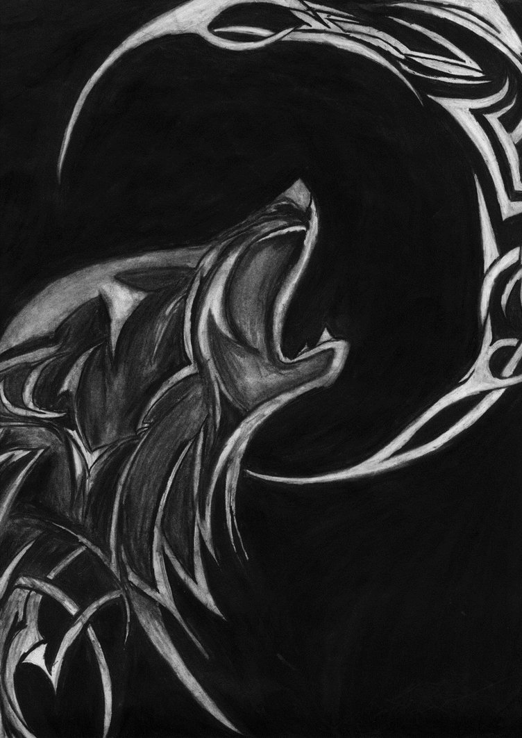Description: A drawing of a wolf with a crescent of flames in the background of a black background with white lines.