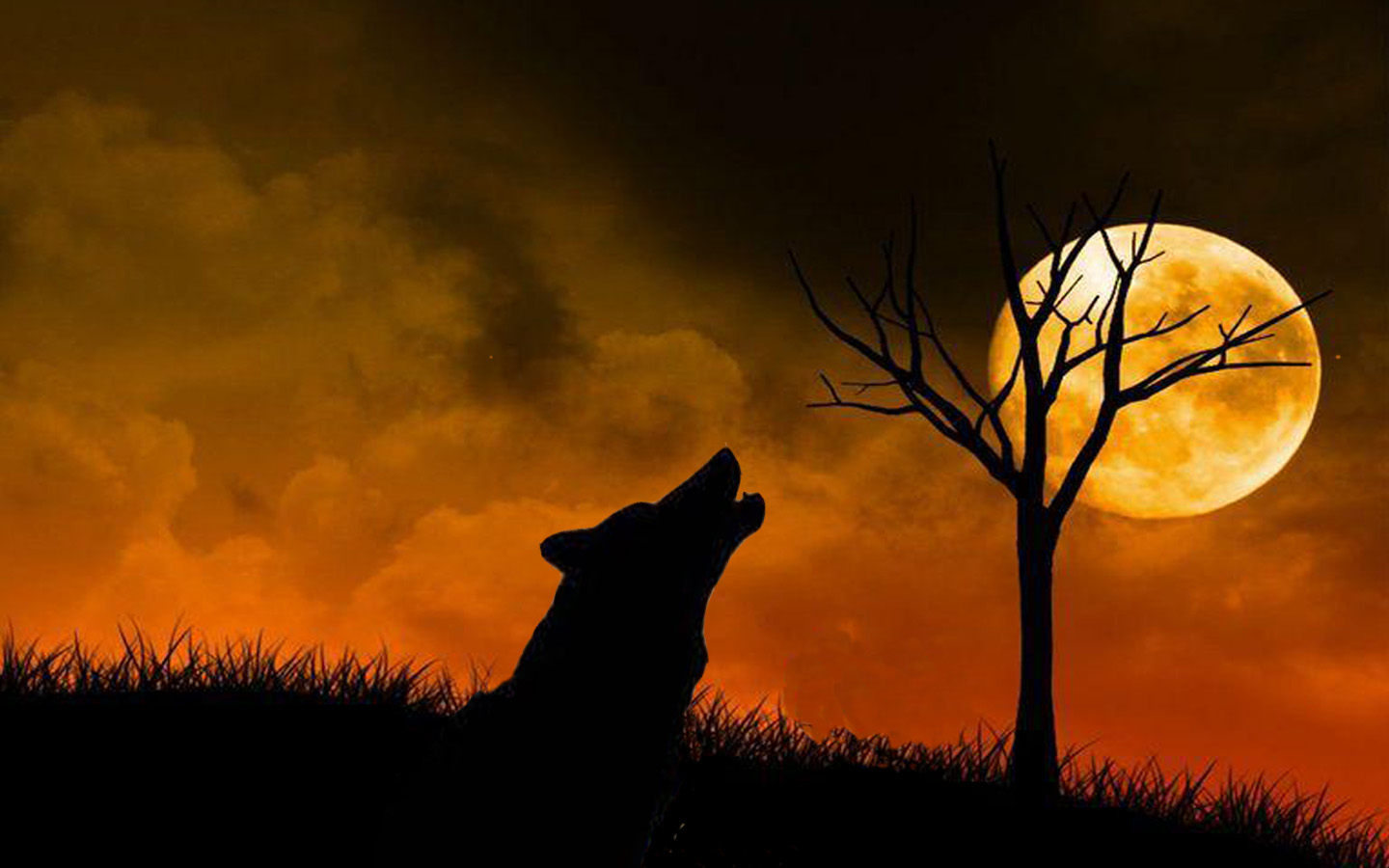 Description: A wolf is looking up at a full moon in the sky above a tree and grass field with a dark orange sky.